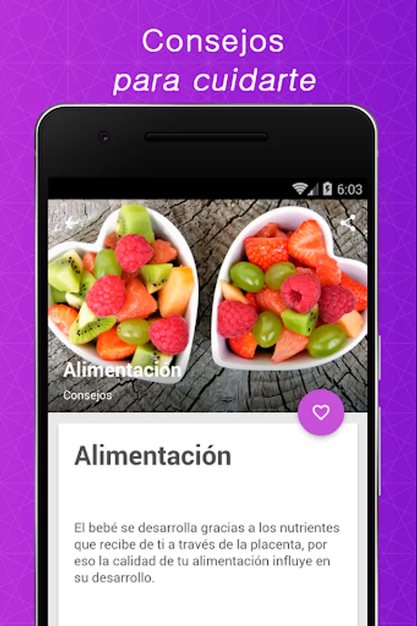 * Weekly information on the changes you notice in your body, the development of the baby and other information on pregnant women explained in a simple, short and easy way.