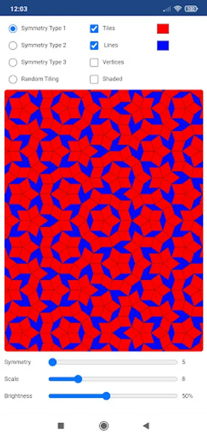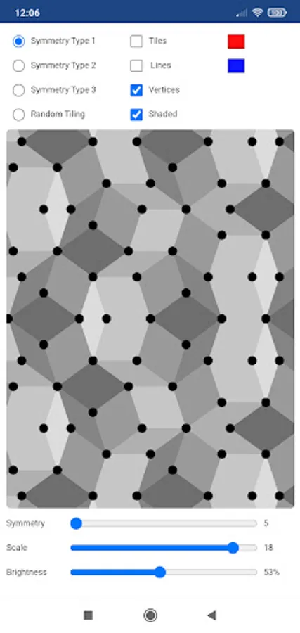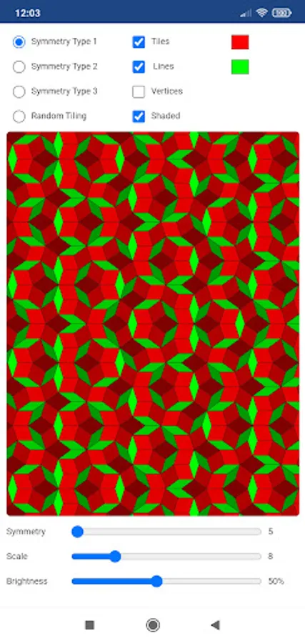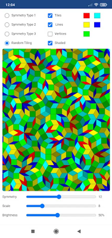 In order to obtain an N-fold symmetry, N grids of equidistantly spaced lines are overlayed, whereby the i-th grid (i=0..N-1) is rotated by 360/N*i degrees. The result is called a multigrid. A dual transformation then generates the rhombic tiles from the cross points in the multigrid. Criteria for distinguishing the tile types can be used for coloring the tiles. A shift of the individual grids with respect to the origin will result in different tilings. One may choose between special values of such grid shifts (symmetry types) or a random tiling. In the latter case each single grid may have a different shift, leading to a much wider variety of tilings.