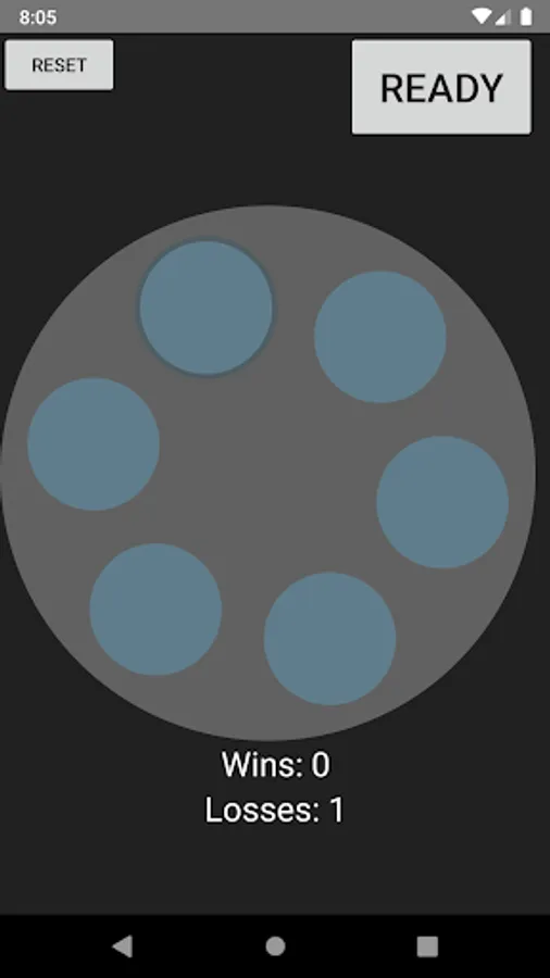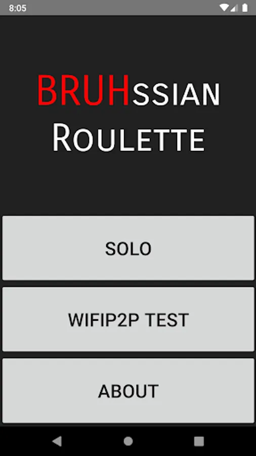 BRUHssian Roulette is a game revolving around the concept of funny, embarrassing situations. In this demo, you can test your luck in a single-player game by pressing the SOLO button on the home screen. From here, you'll be presented with the game screen, where you can either spin the wheel or press your luck right away by pressing the READY button. If none of the remaining slots feel safe, simply hit the RESET button to randomize the wheel and reset your odds to 1/6. If you lose, a random image from your phone will be displayed on-screen for all to see. So, you feeling lucky, bruh?