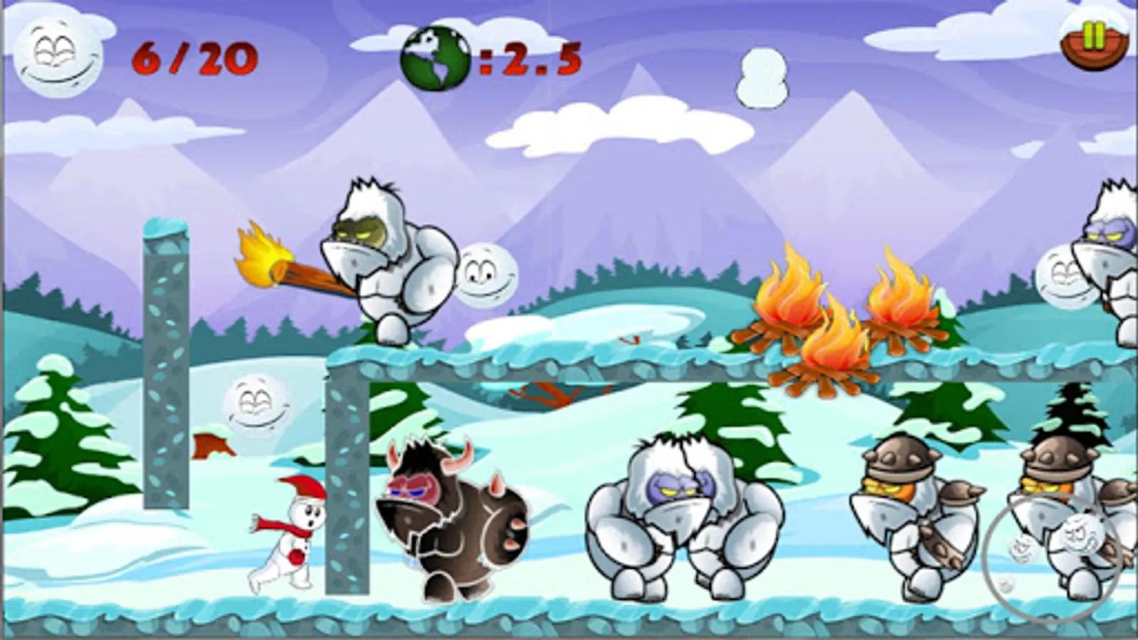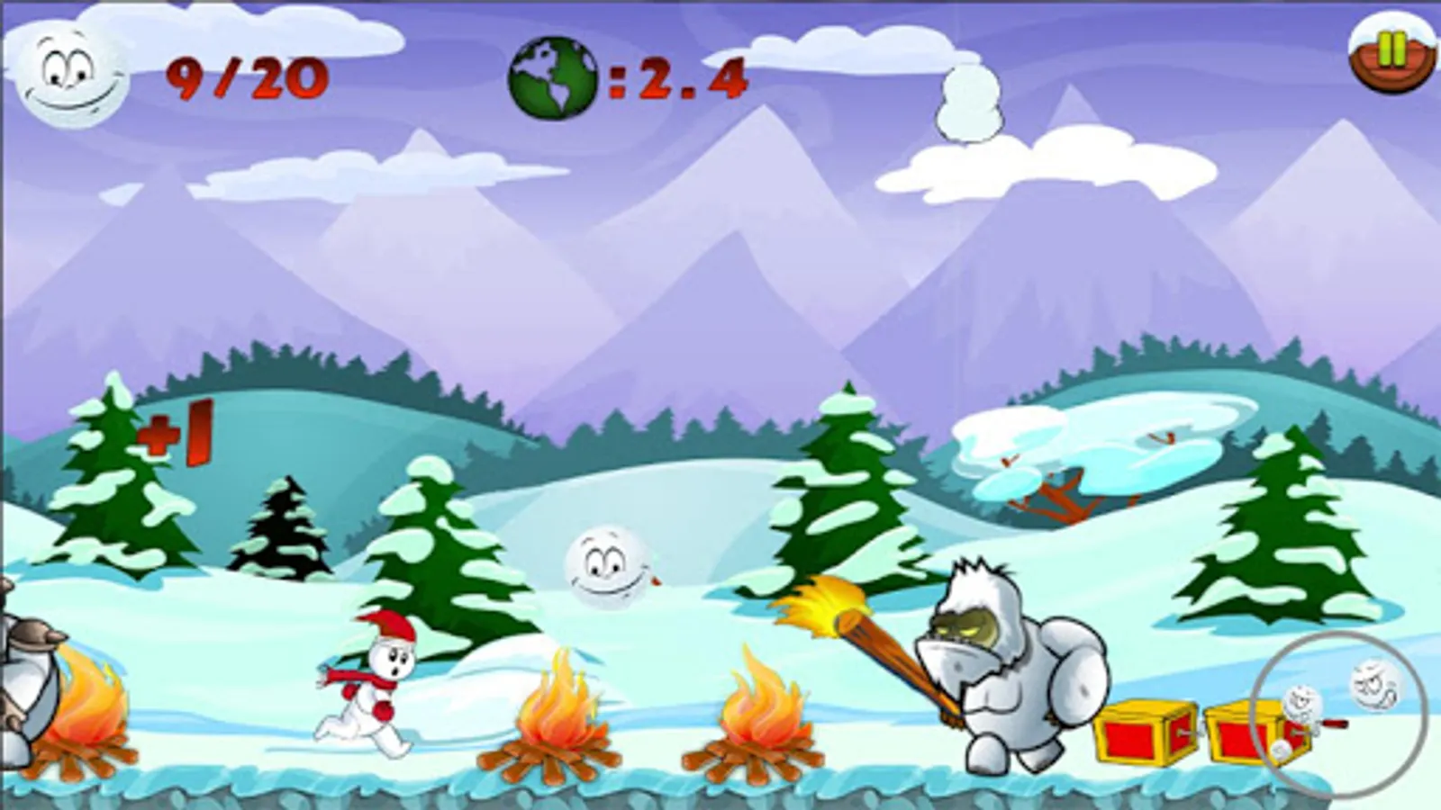 - Run and collect all the parts needed to make the snowman on each level without being caught by angry yetis.