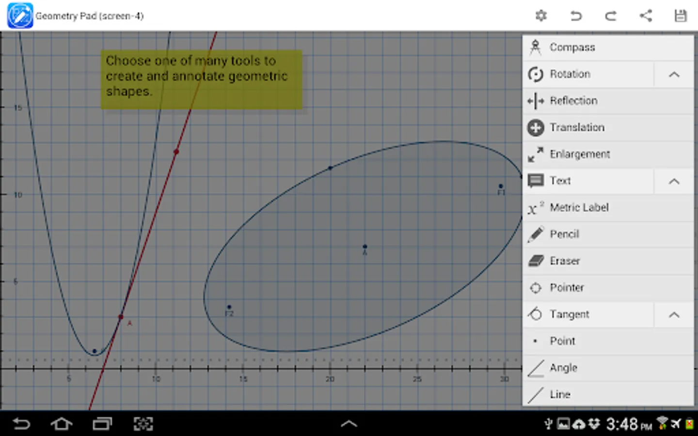 With Geometry Pad you can create fundamental geometric shapes, explore and change their properties, and calculate metrics. The shapes are displayed on a scrollable and zoomable workbook with a rectangular coordinate system.