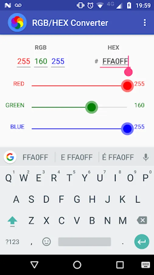 If you prefer you can also adjust the intensity levels of the primary colors and thus automatically obtain their color codes in RGB and HEX formats, and you can view the color formed on the display of your smartphone as you adjust their intensity levels .