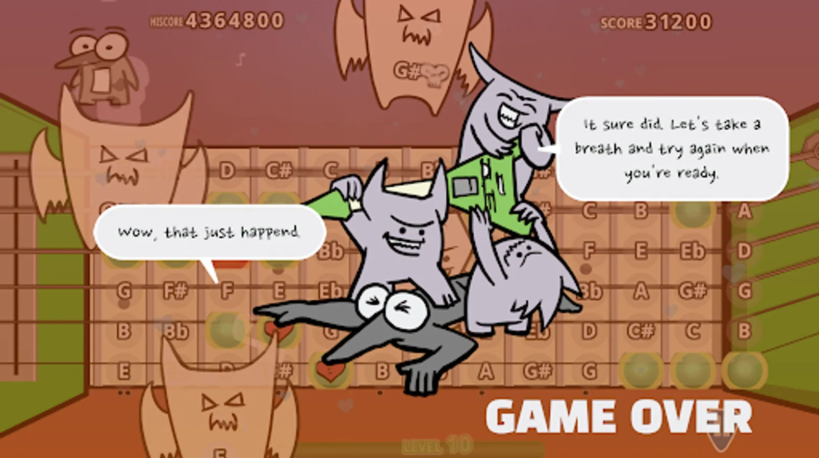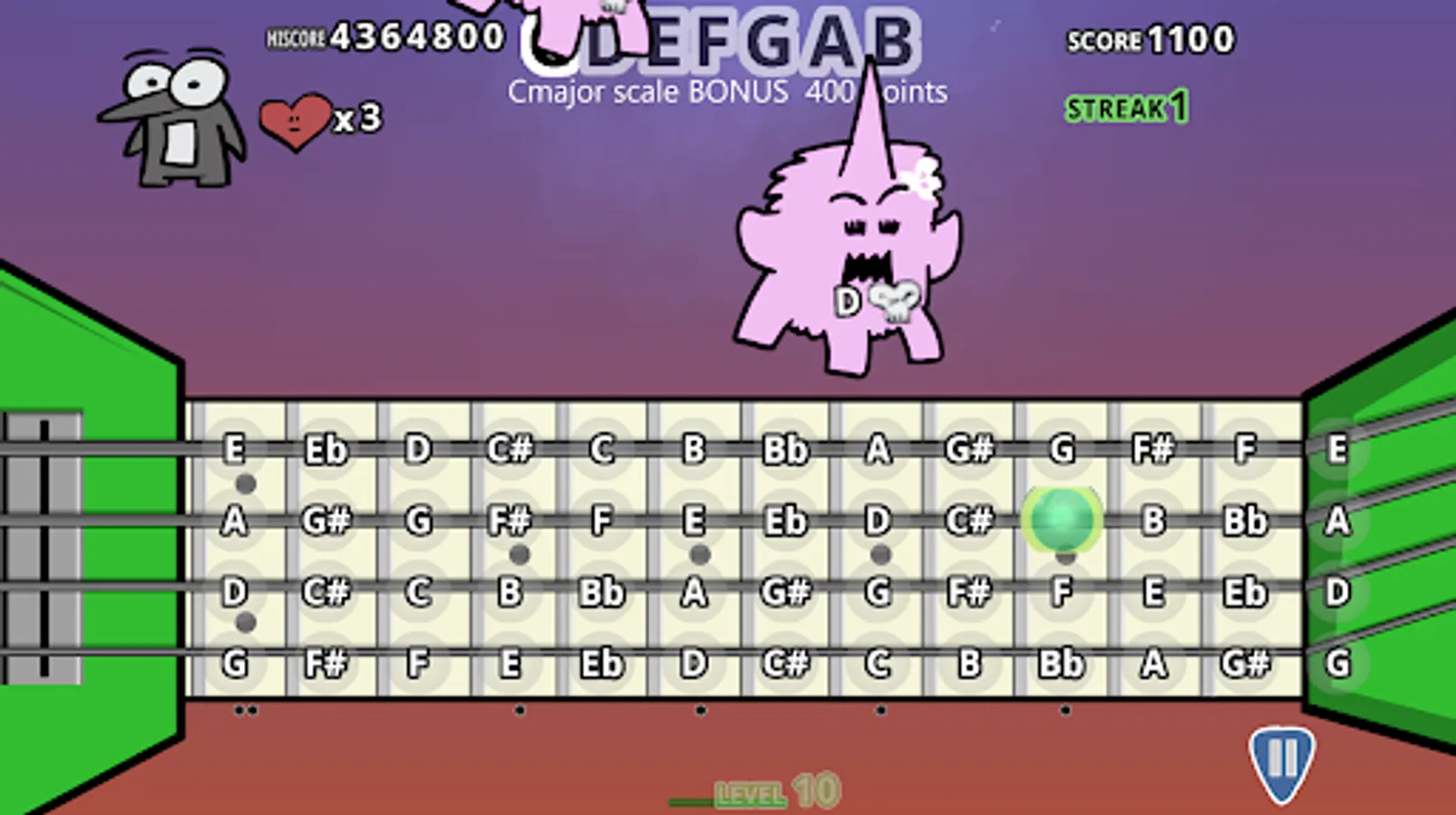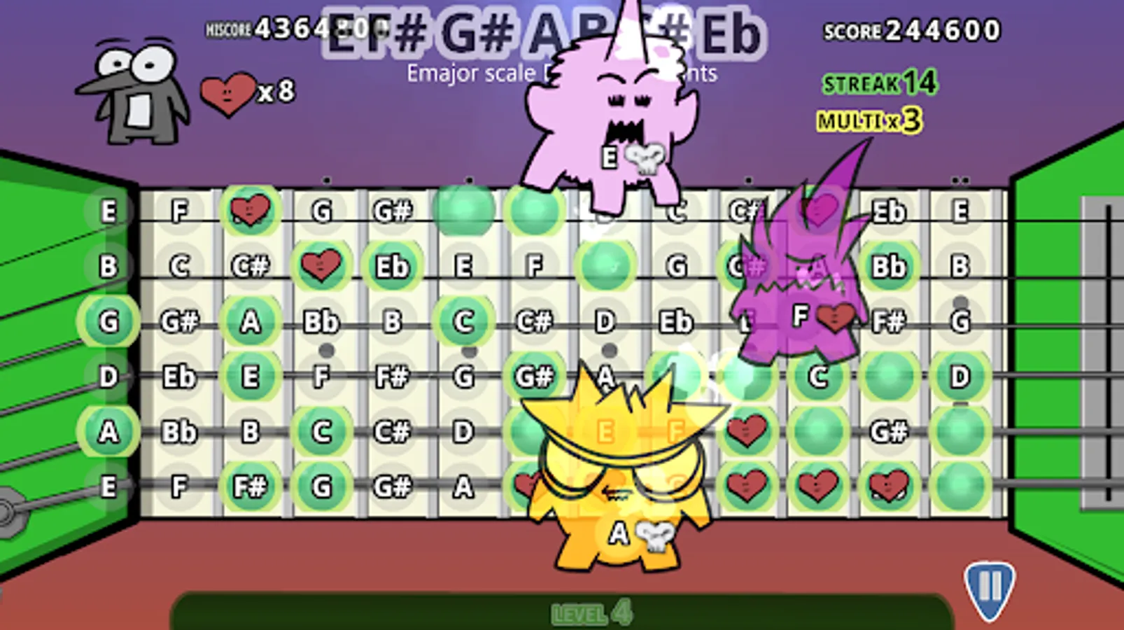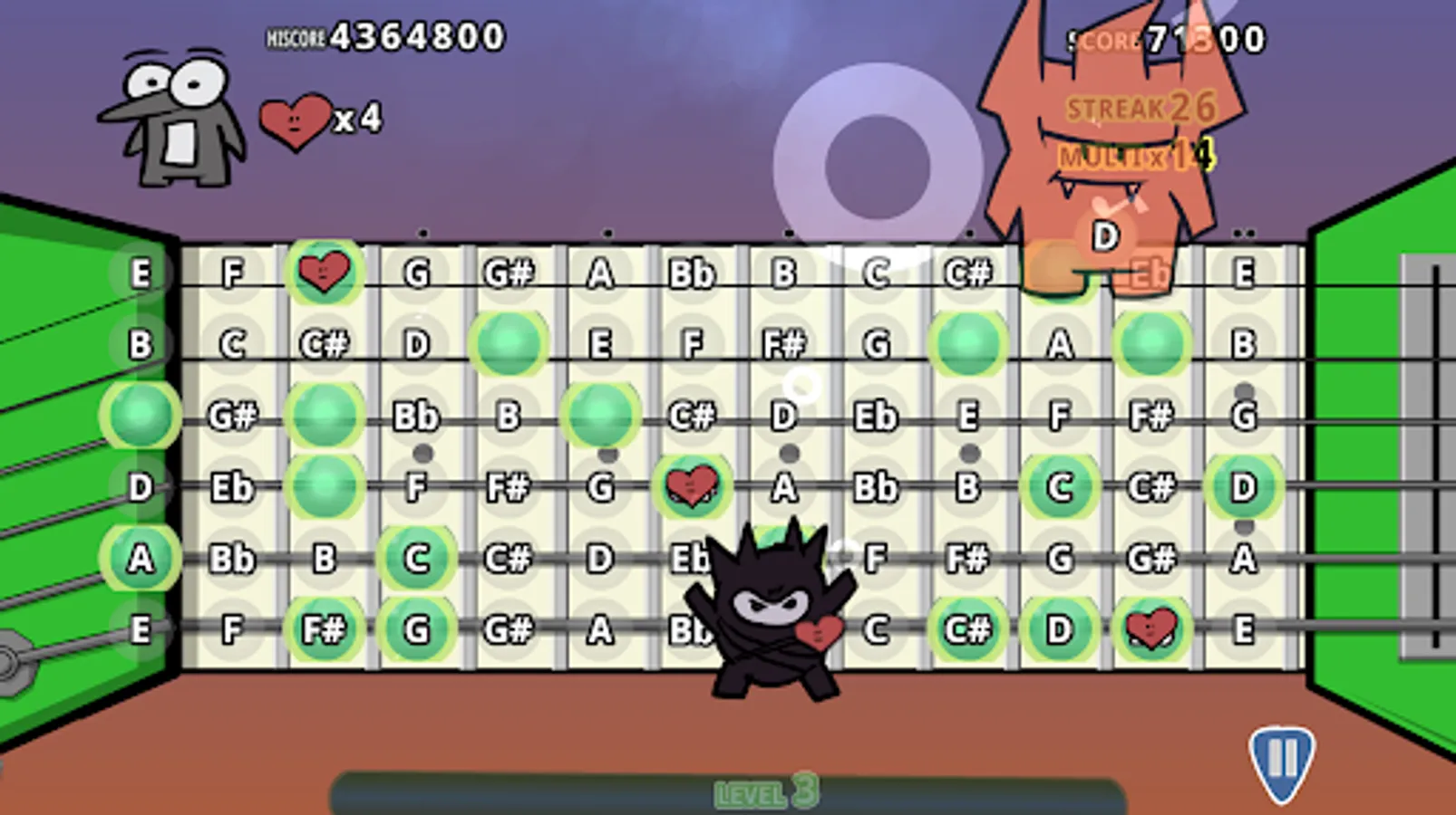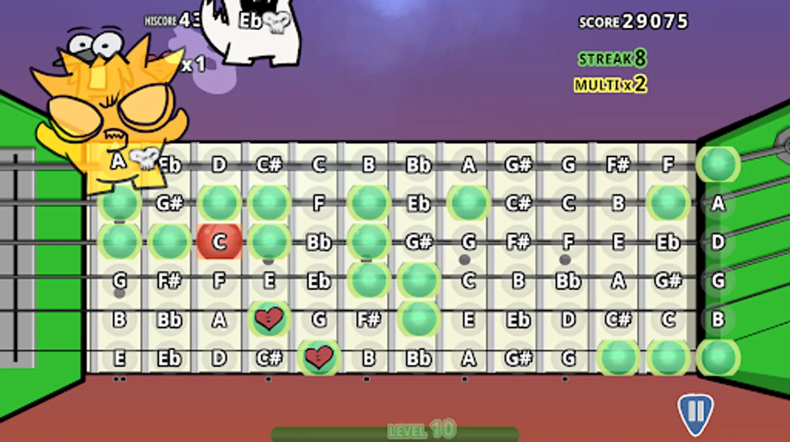 Match the notes, score health and points. Find note patterns and hints. Along the way learn patterns of notes on the guitar fretboard.