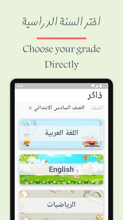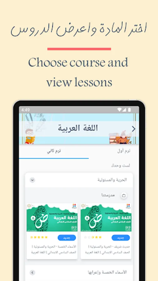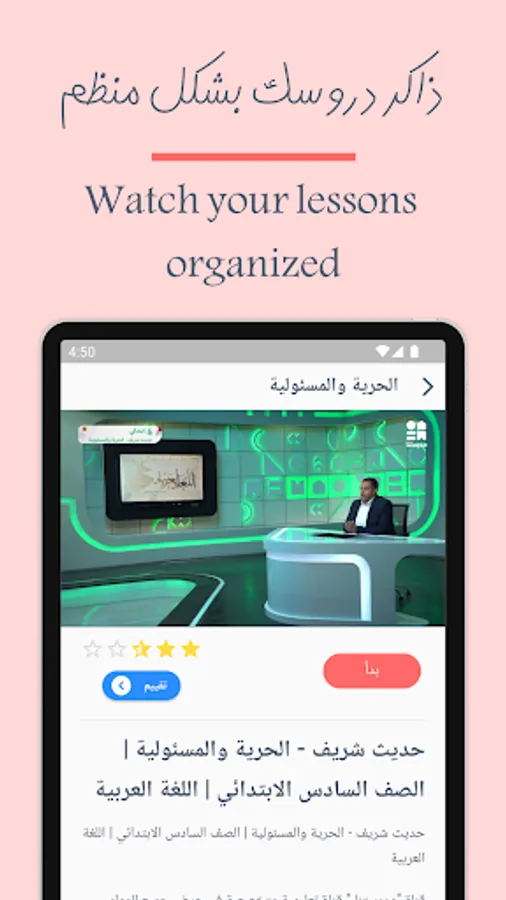 The application introduce video lessons in an easy and organized way, where students can choose their grade to show the grade courses and choose the course to show list of units and lessons divided by semesters, then select the lesson video that was labeled with watching status as new, progress or complete for the previously watched videos.
