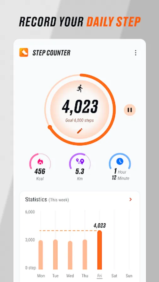 With our step counter app, you can easily view your daily steps, calories burned, walking distance, and active time. By utilizing advanced sensors in your phone, the pedometer app automatically counts your steps whenever you move. Through this feature, you can set personal daily step goals. The step counter will provide notifications and progress tracking, showing you how many steps you've completed in a day and how much walking distance you have left to reach your goal.