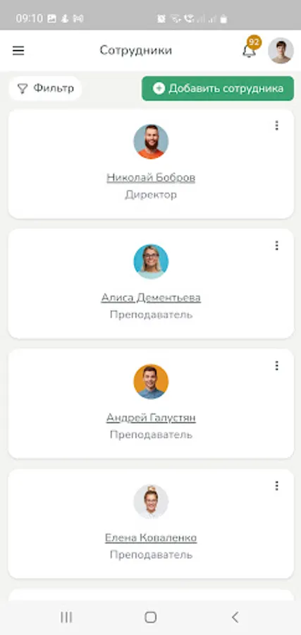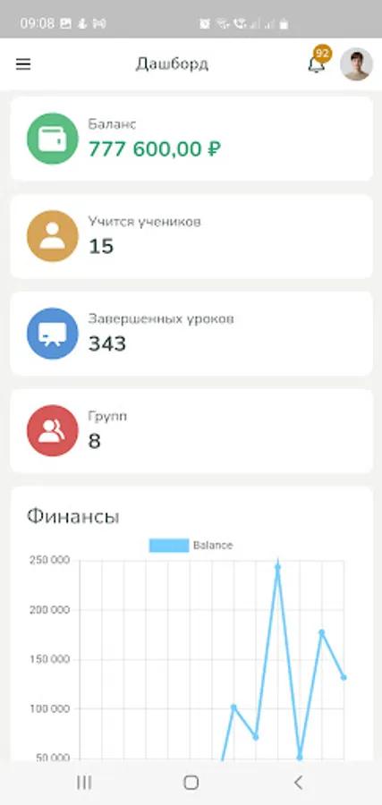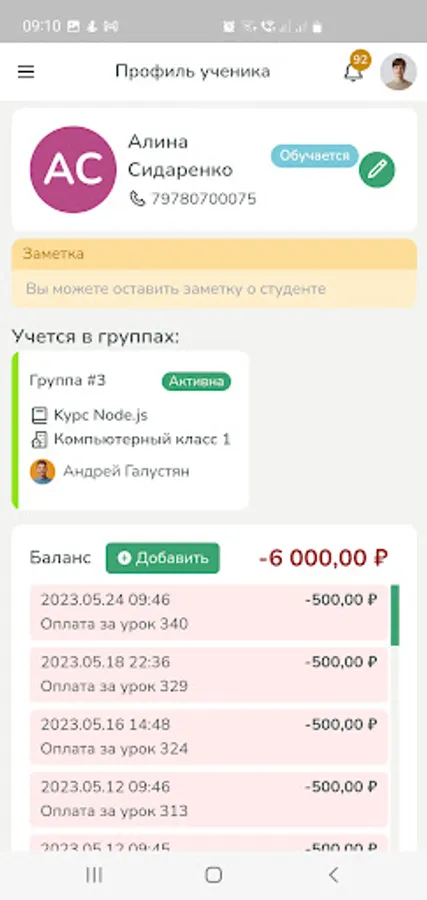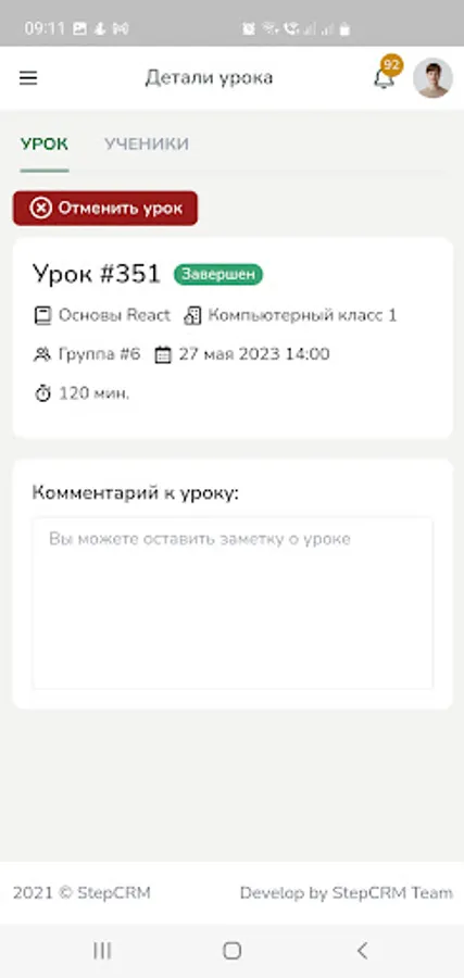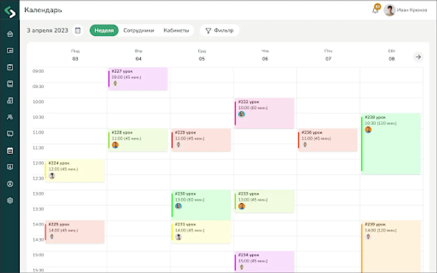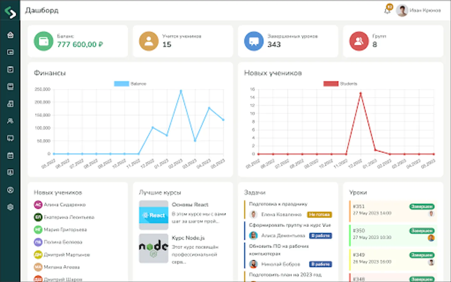 CRM system for managing and controlling schools, learning centers, studios. Management of lesson schedules, financial accounting, tasks, feedback for the student.