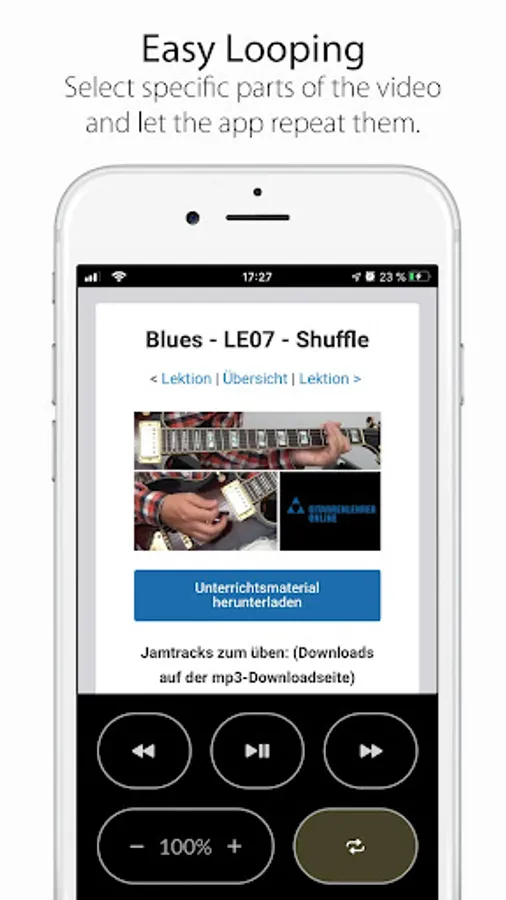 Set a loop and let the app repeat certain parts of the video. Adjust the tempo of the video in 5% steps. Play/Pause and forward or rewind.