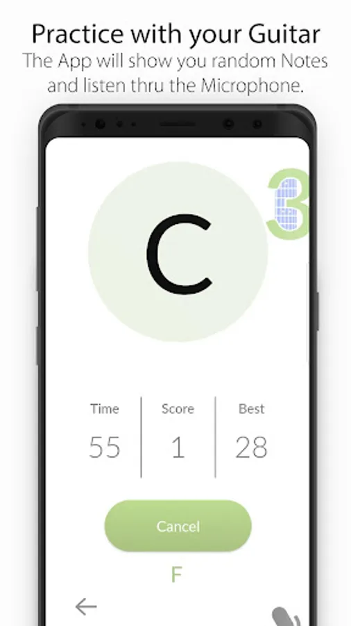 If you play the correct note the App will ask for another random note and gives you one point. If you play a wrong string one point will be deducted.