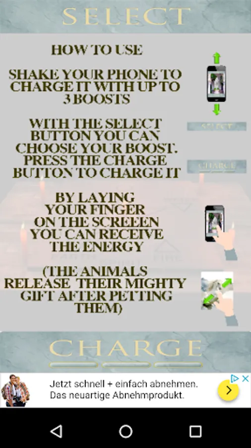 You can choose between several positive boosts like: Luck, Energy, Fatburning, This app pretents to give you the possibility to choose an positive feature and absorb the fake energetic by touching the screen.