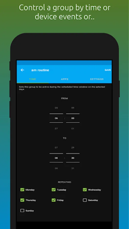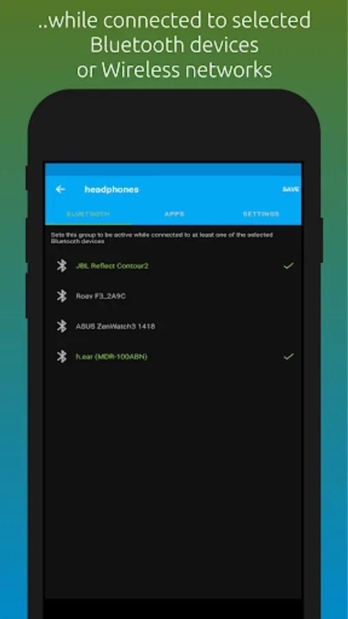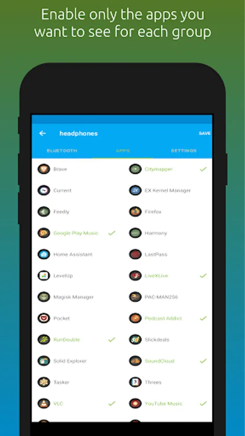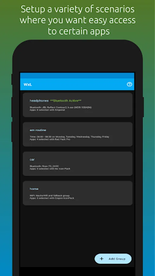 • Open the app, create a group by selecting which context settings and apps to show when the scenario is active, create as many groups as you want