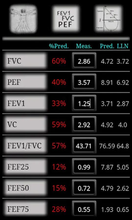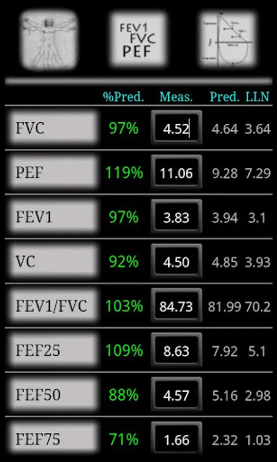 - Predicted value, %Predicted and LLN of FEV1, FVC, VC, FEV6, FEV1/VC, FEV1/FVC, FEV1/FEV6, PEF, FEF25, FEF50, FEF75, FEF25-75, TLC