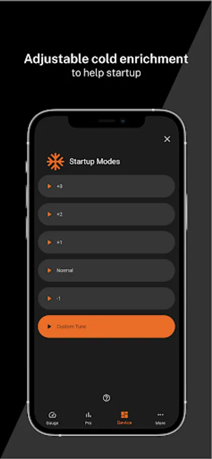 ADJUST: RPM based enrichment with driving mode selection (save up to three custom driving mode settings created with eFlexTuner software) & cold enrichment (save a custom setting created with eFlexTuner software)
