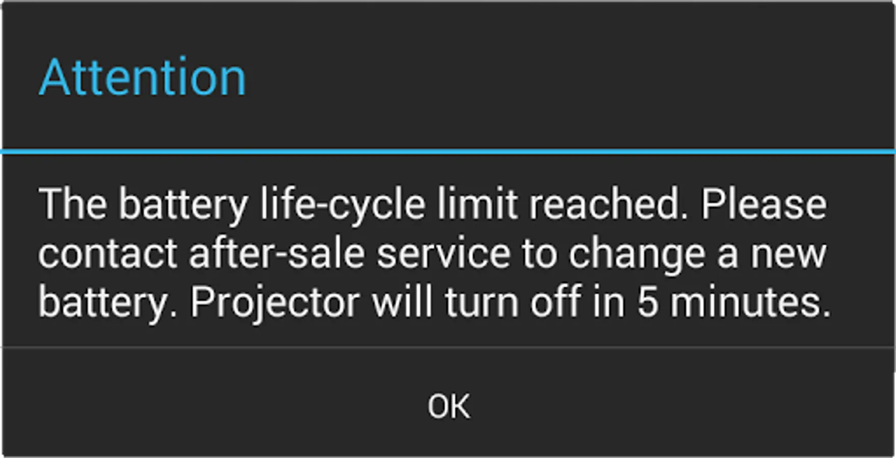 "The battery life-cycle limit reached. Please contact the after-sale service to change a new battery. Projector will turn off in 5 minutes."