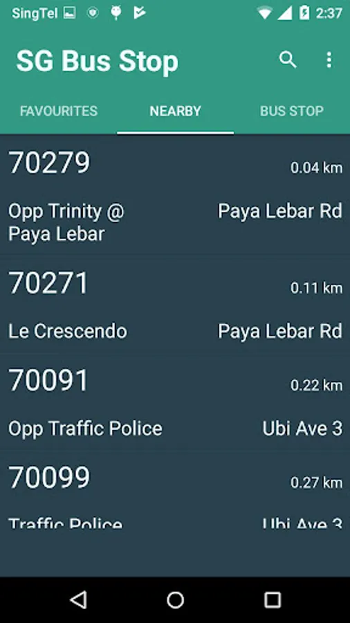 Based on your current location, SG Bus Stop will determine the nearby bus stop and list with their details. You can also view the distance from your location to the bus stop in 'km'. The nearby list will display till 1.5km radius of bus stop details.