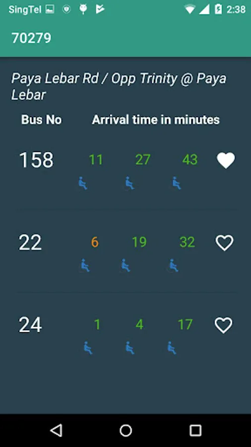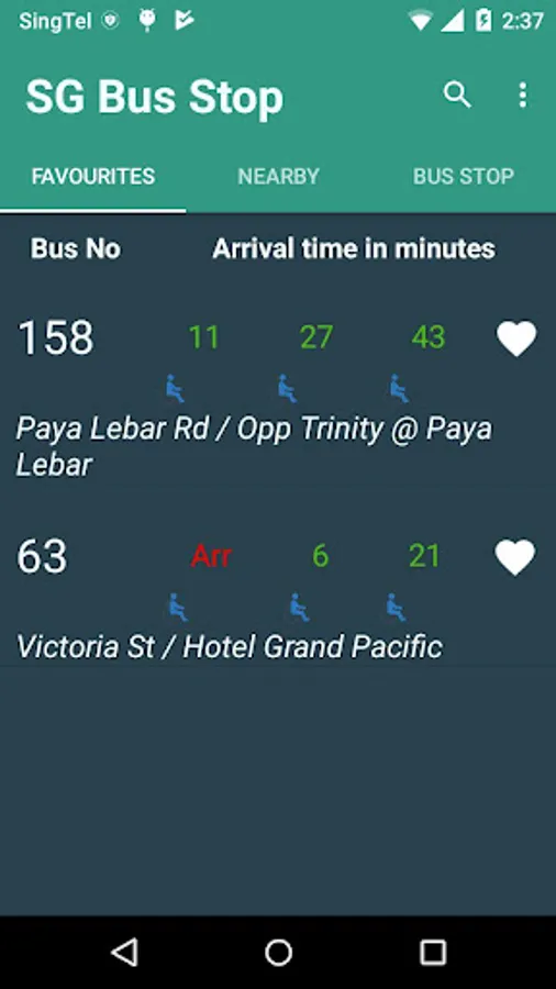 You can add bus stops to your favourites for easy access. To add a bus stop to your favourites, you can tap the heart button of a selected bus stop. When you open a favourite bus service list, all the routes will auto load the bus arrival times.