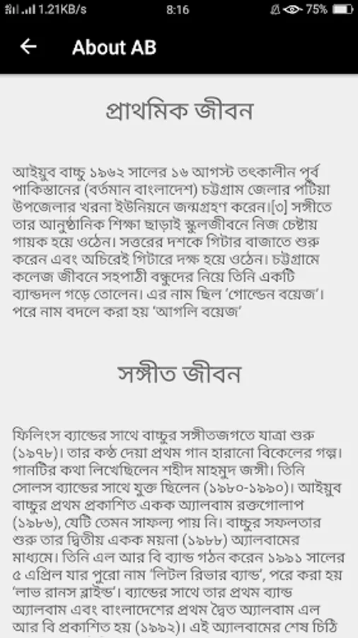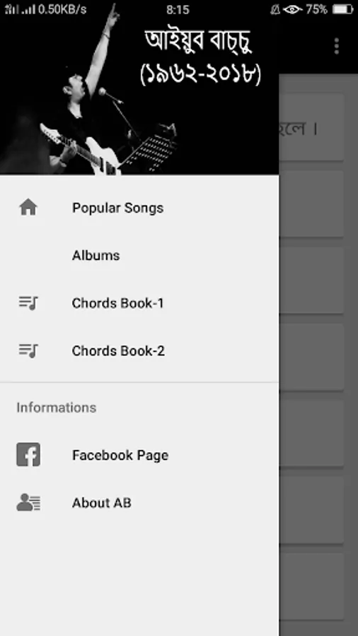 Ayub Bacchu is one of the most famous singers and guitarists of Bangladesh, he has not been back in our country for a while, but he has left us all the immortal songs, and this app will be very helpful to play them more easily. Because here you'll find Lyrics and Cards, you see more Ayub Bachchu's Jiboni and his album's detailed information. This immortal tribute of singer and guitarist.