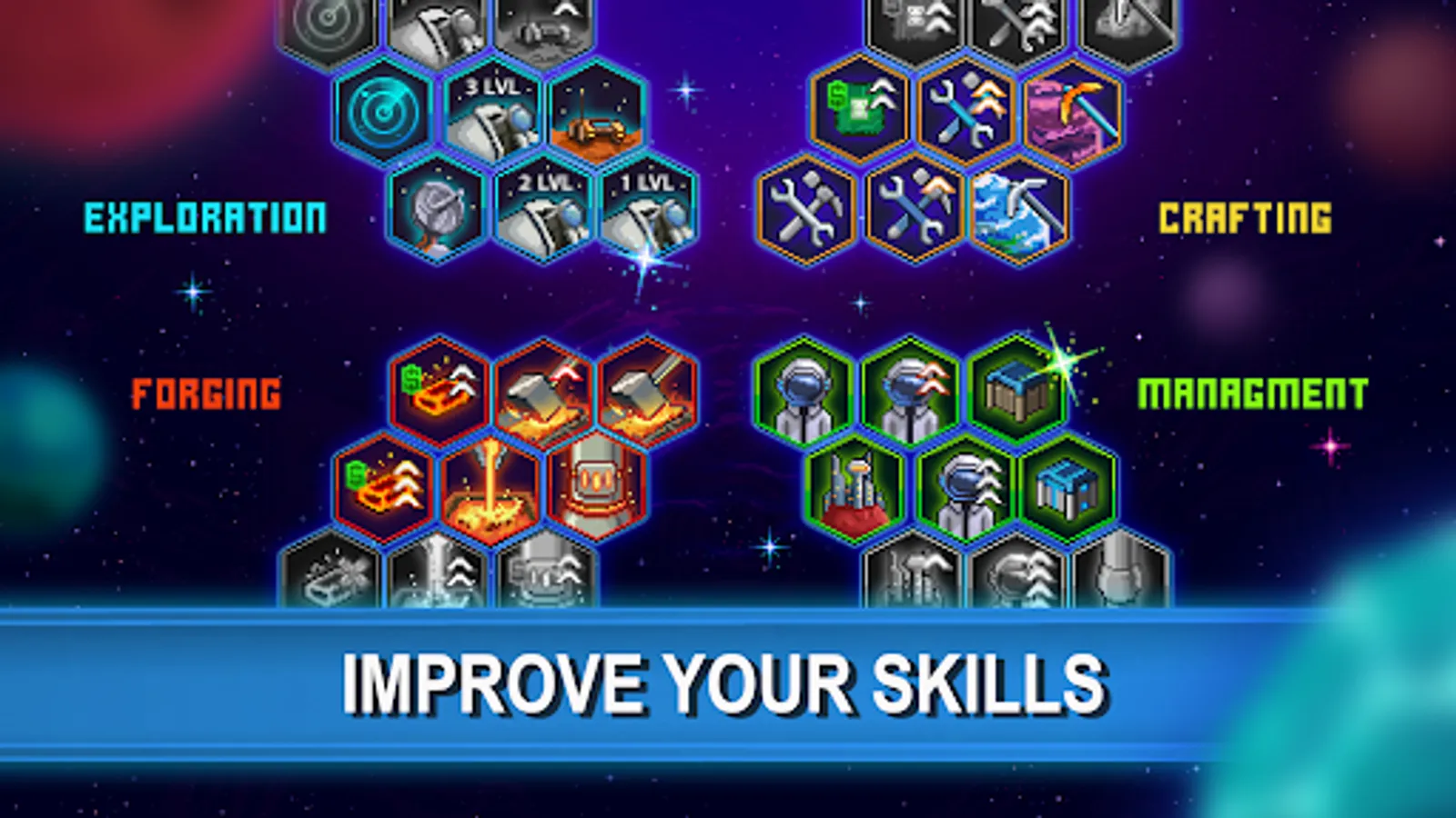 Hire managers to mine more resources and leave them to manage colonies, productivity will grow under their leadership. Learn new skills to accelerate the development of your expedition.