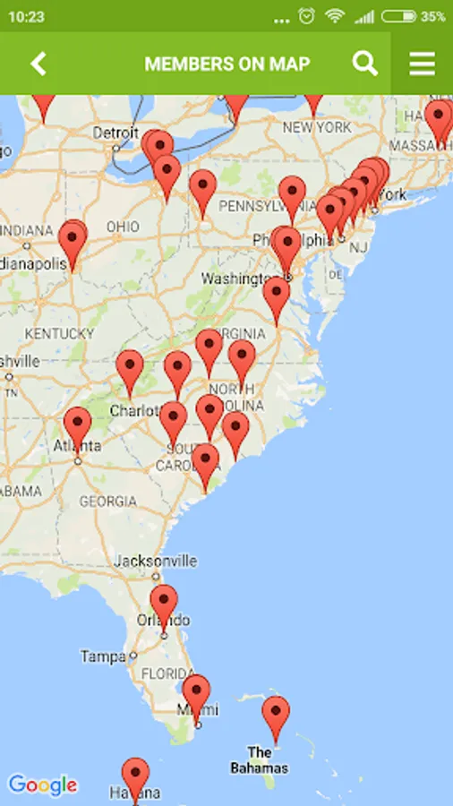 Users are taken directly to a map with all members displayed as pins. Click on a pin and a small pop-up appears with the name of the member and a “detail button”, which takes the user to a page displaying the details/contact information of the member in question. Email addresses and telephone numbers are interactive. Click on either to open the email program or make a call.