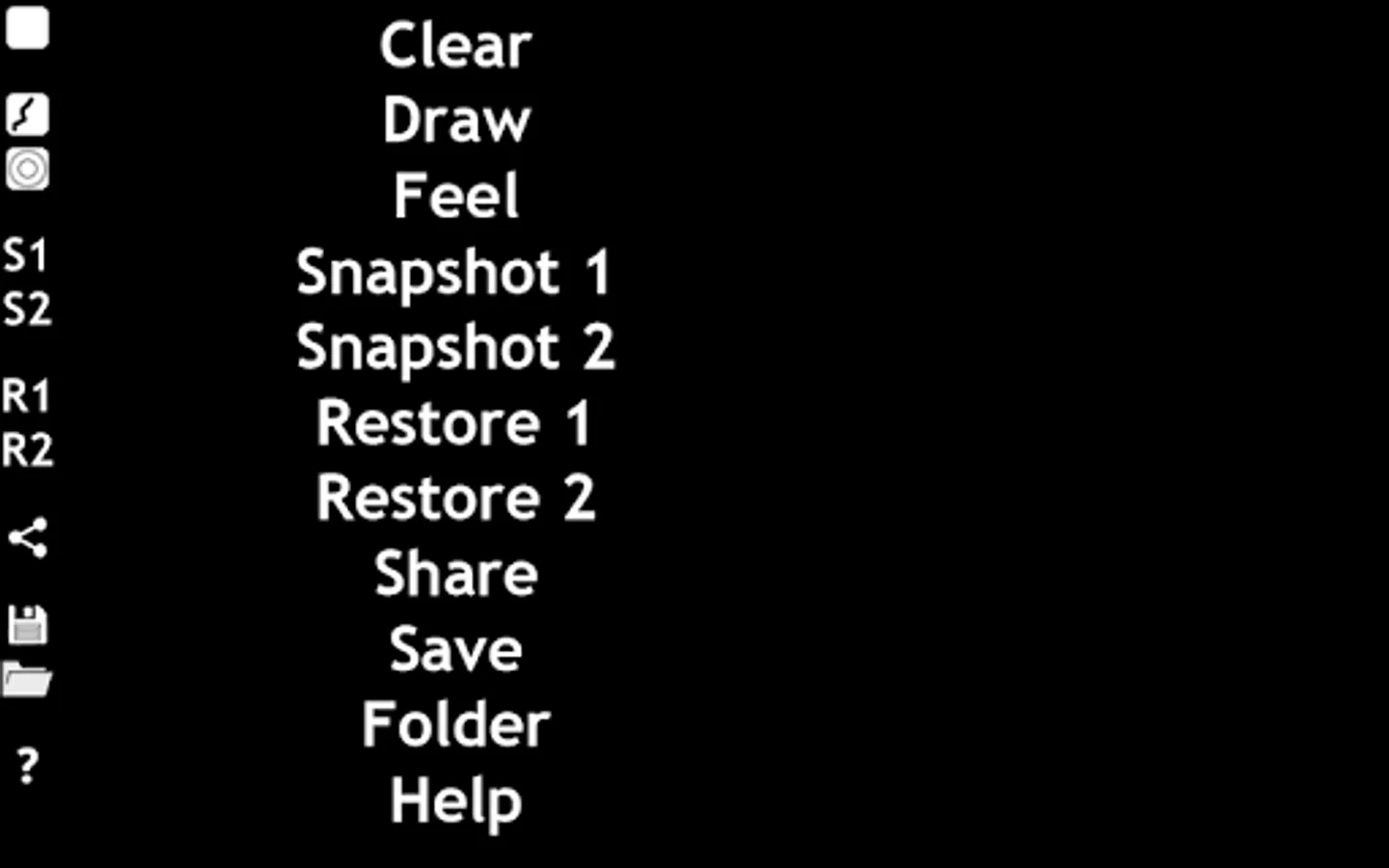 Buttons are on the left edge when device is held in Landscape mode. The buttons are Clear, Draw, Feel, Snapshot, Restore, Share and Menu which leads to Save, Folder and Help. If device is held in Portrait mode, the buttons will appear at the top edge. The Clear button will be at top-right then.