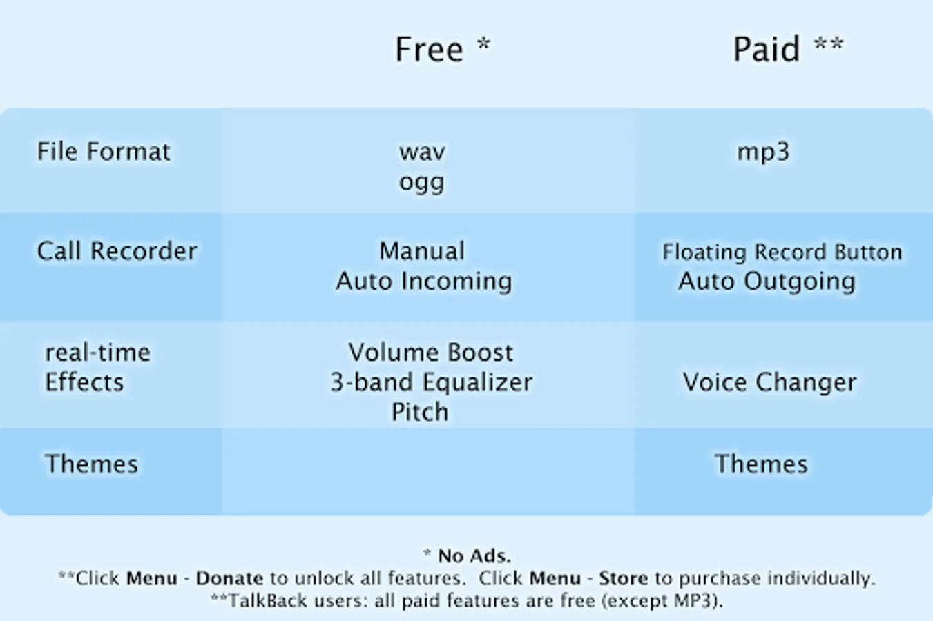 - Paid: MP3, Voice Changer, Call Recorder (auto-outgoing), Themes, Noise Gate, Voice Activity Detect