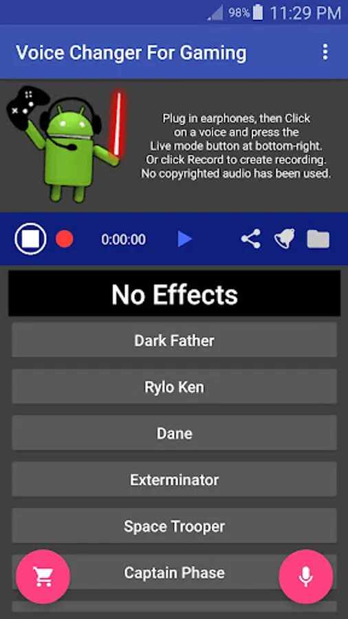 Instantly change voices, by clicking on a voice, or click No Effects for no effects: