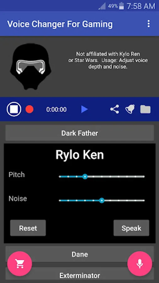 We disavow any and all affiliation with these character voices. They are the property of their respective owners. Using Dark Father, with some voice acting effort, you can mimic a voice that sounds like Darth Vader.