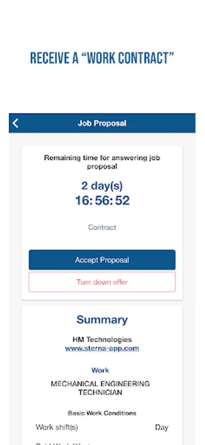 If you’re selected among others by the hiring company a “Work Contract” will be sent automatically in your native language among others. You will have a pre-defined period of time to either accept or decline it. In the event where the offer suits you, STERNA will accompany you in post-hiring processes related to Immigration, Mobility & Integration. Furthermore, the STERNA app will keep you informed in real time and update your status along the way.