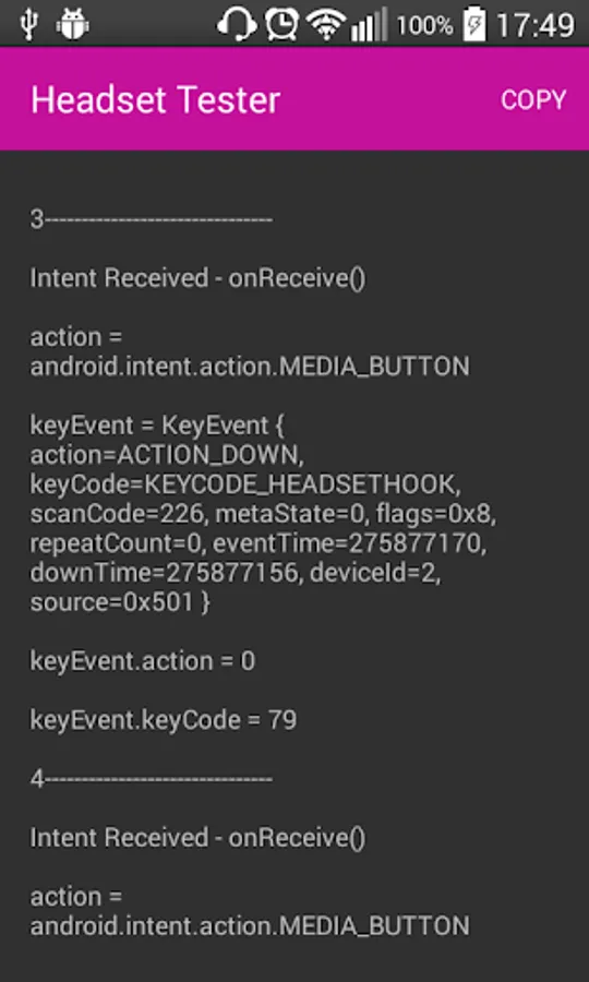 Start the app, connect your earphones/headset and press the remote controls on it, an event log shoud appear. Use the Copy button in the top-right corner of the app to copy the log to clipboard.