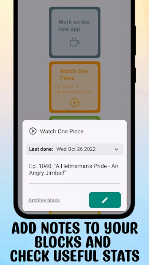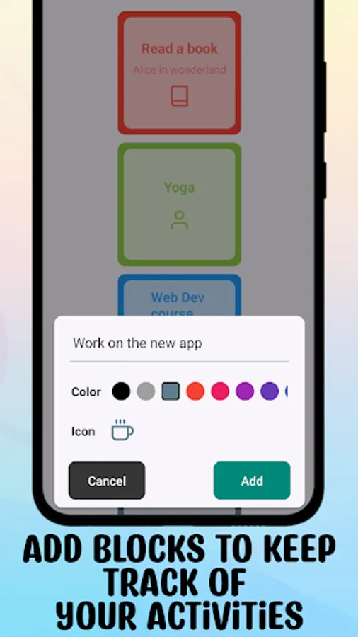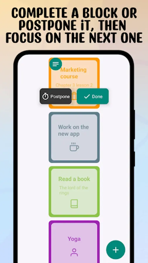 Can't complete the block as your next activity? Don't worry. You can postpone it or just complete another one. There are no rules, only your peace of mind.