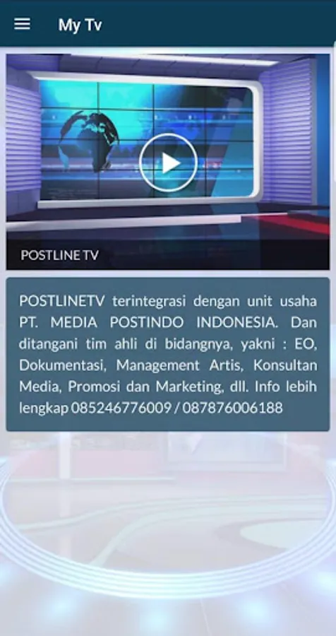 POSTLINETV integrated business unit of PT. MEDIA POSTINDO INDONESIA. And handled a team of experts in the field, namely: EO, Documentation, Artist Management, Media Consultant, Promotion & Marketing, etc. More info 085246776009/087876006188