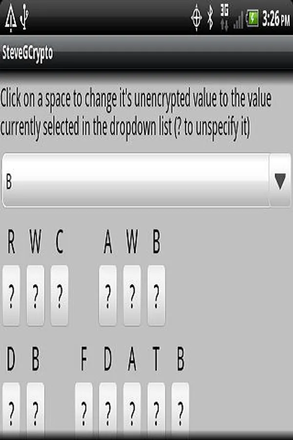 This is a cryptography app. You select which letter you want to substitute via a dropdown, then you click on the unencrypted letter you want to change to the value you selected in the dropdown.