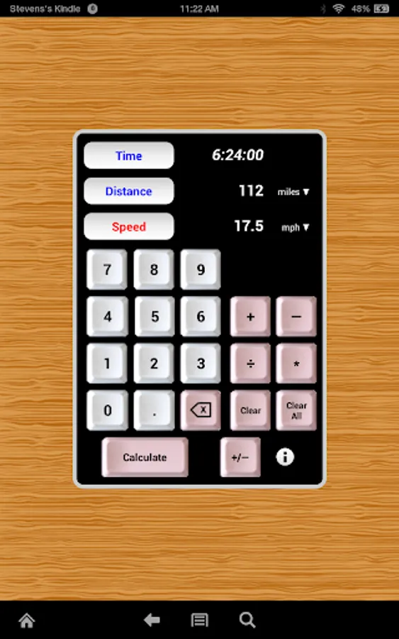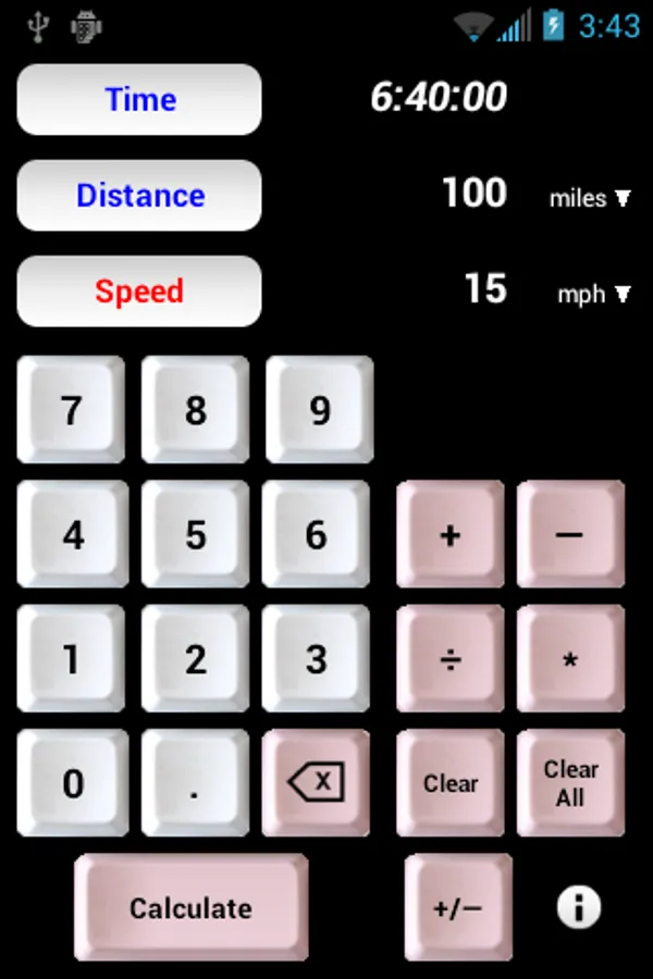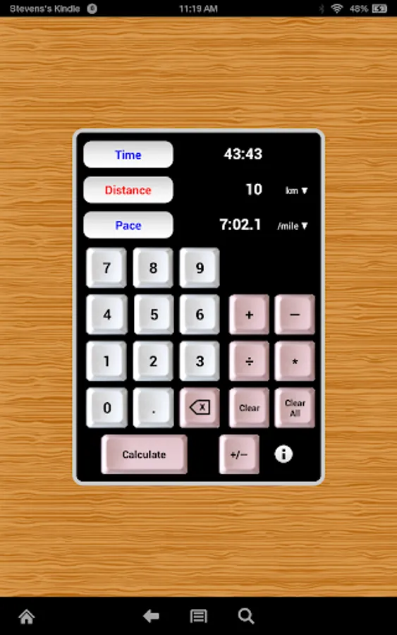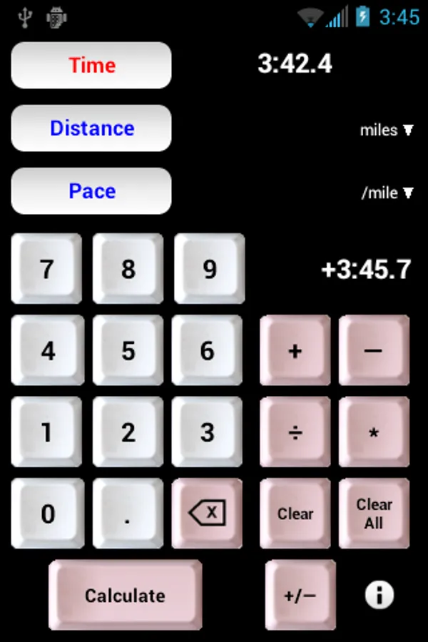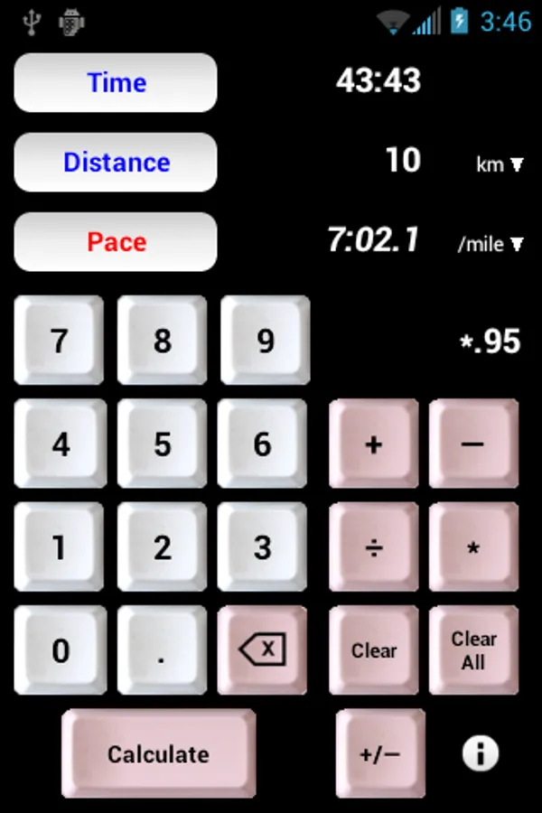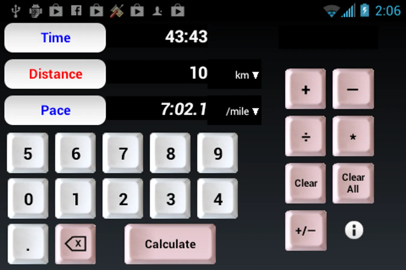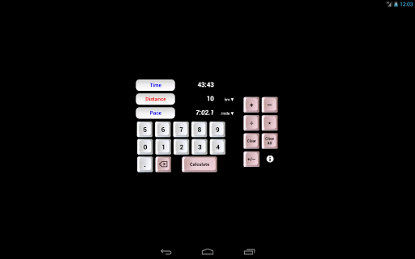 • Calculate time, distance, or pace (speed) by entering any two and calculating the third.