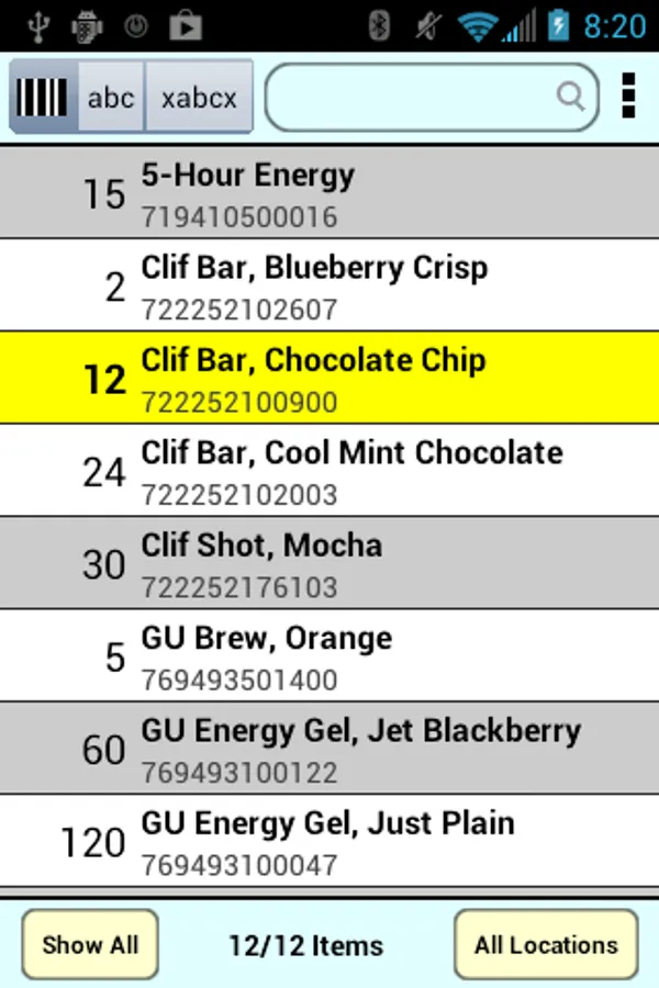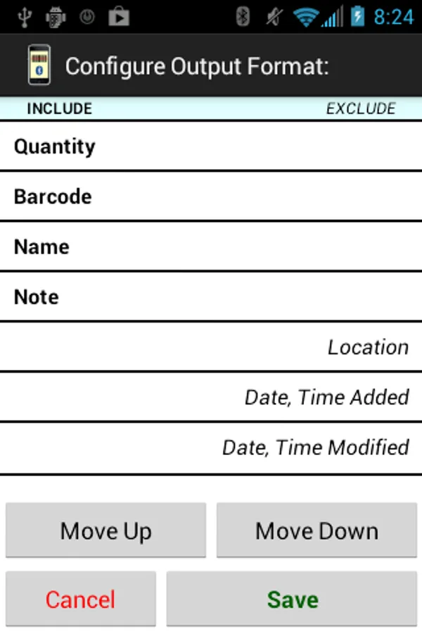 o Information for each item includes quantity, barcode, name, note, named location, and date/time the item was created and last modified.