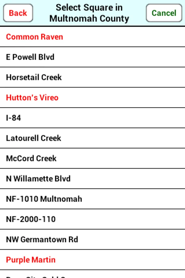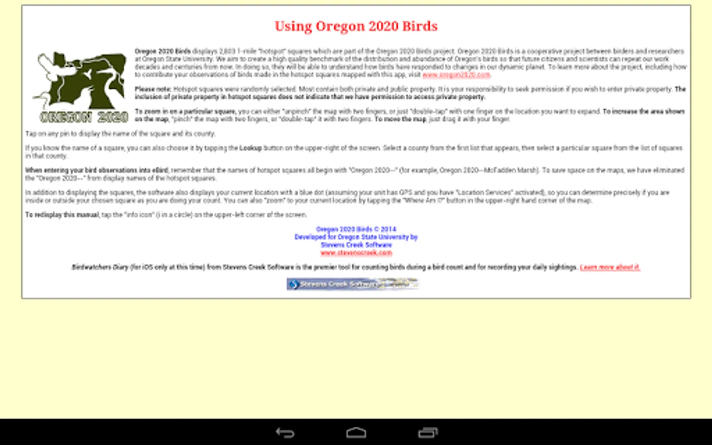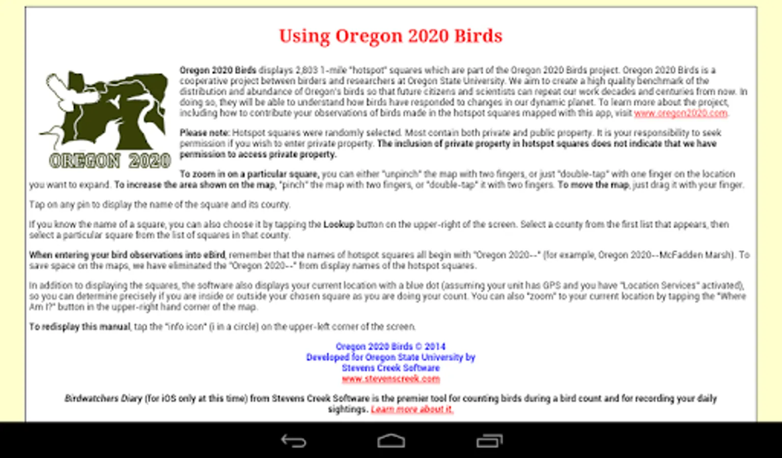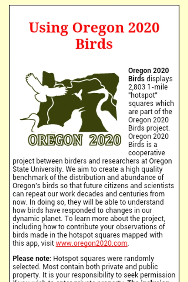 Designed for the Oregon 2020 Birds project (www.oregon2020.com), the app displays 2,783 1-mile "hotspot" squares, and allows users to choose desired squares to survey by county and then by name.