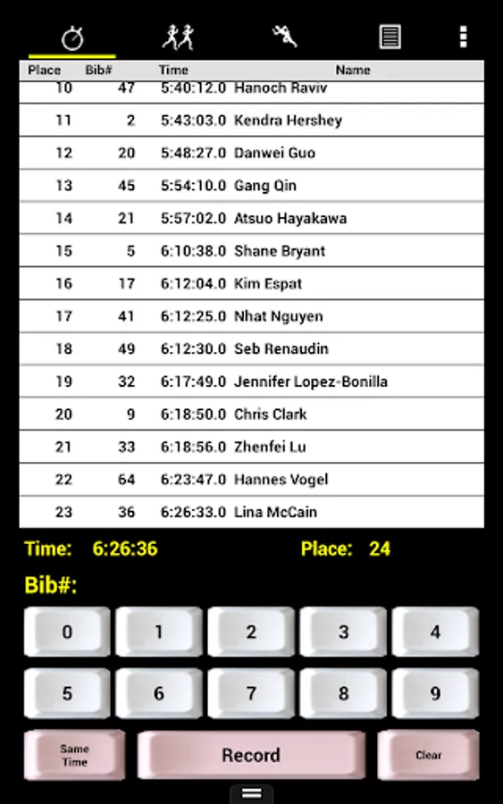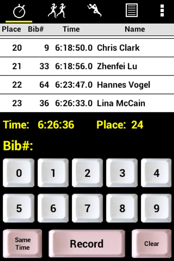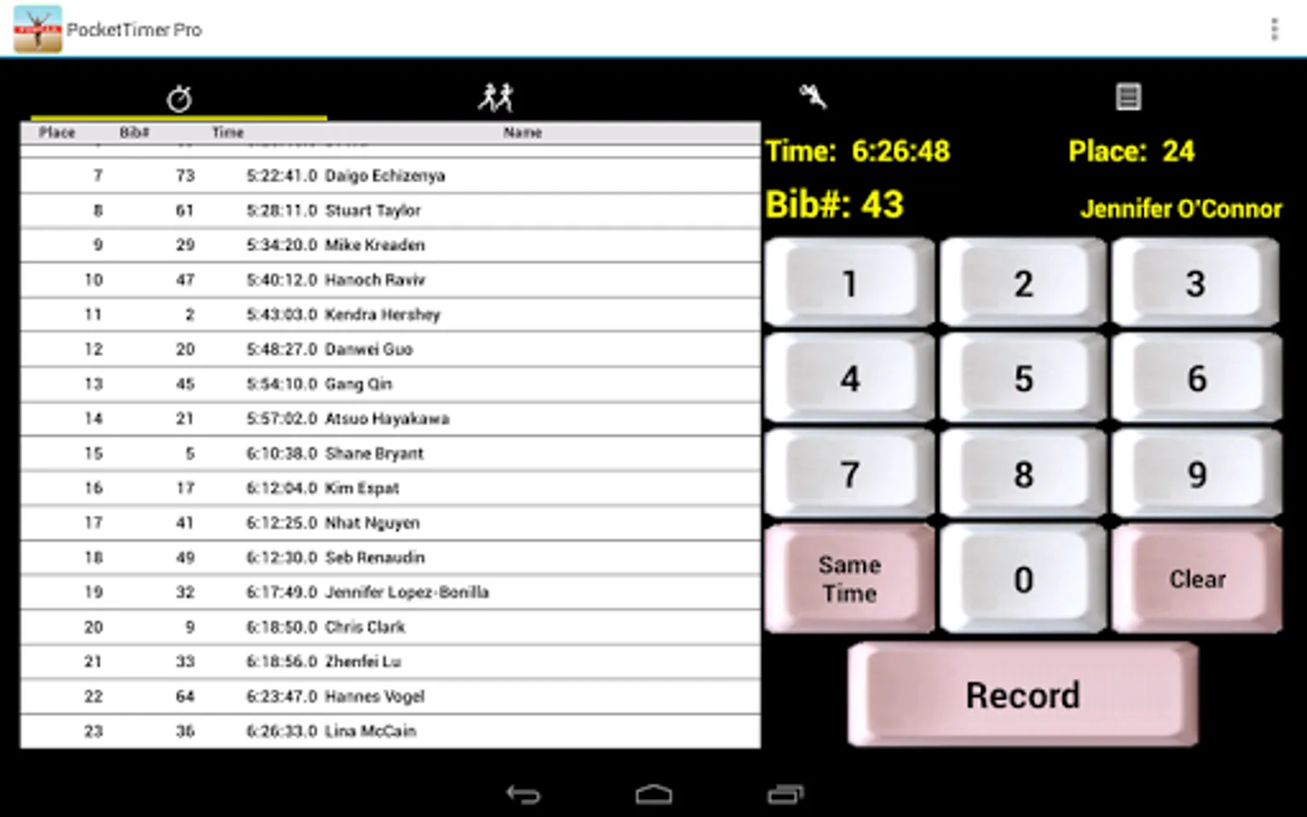 • Easy entry of bib#'s of finishers using large on screen buttons with audio feedback