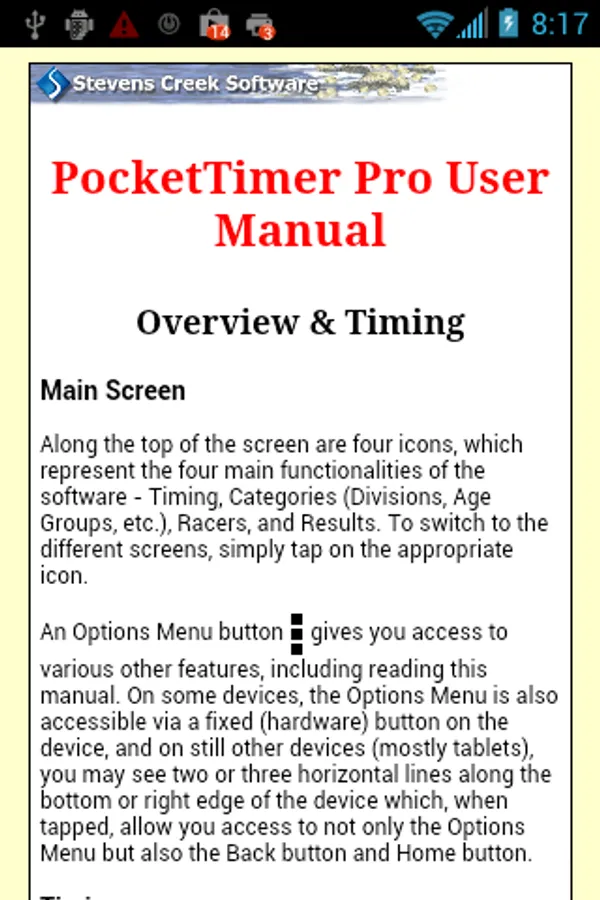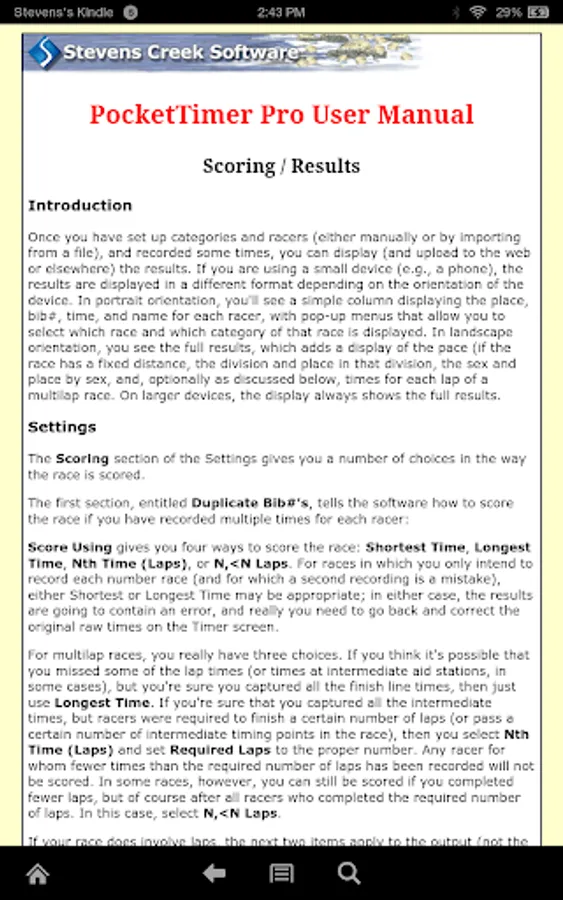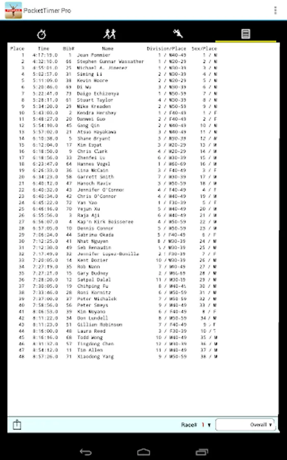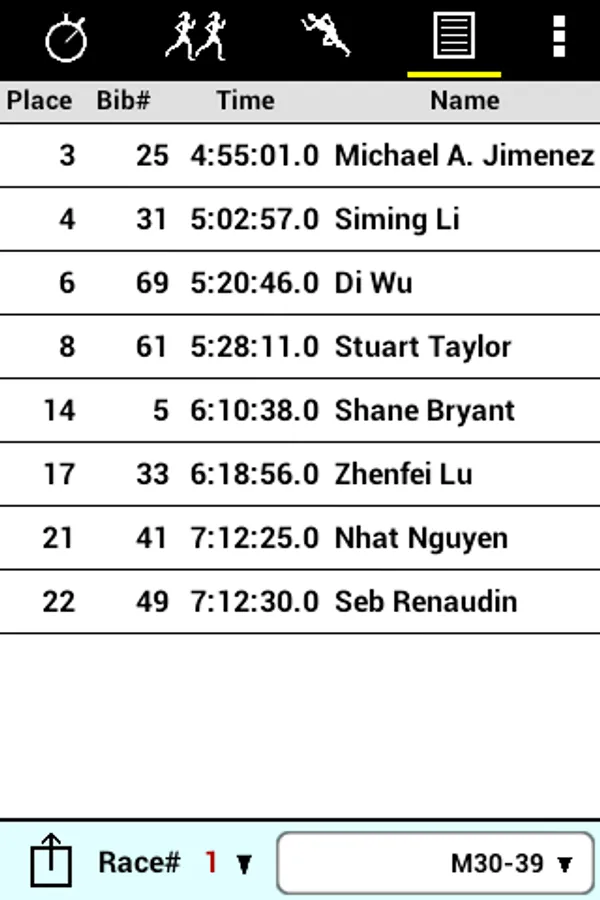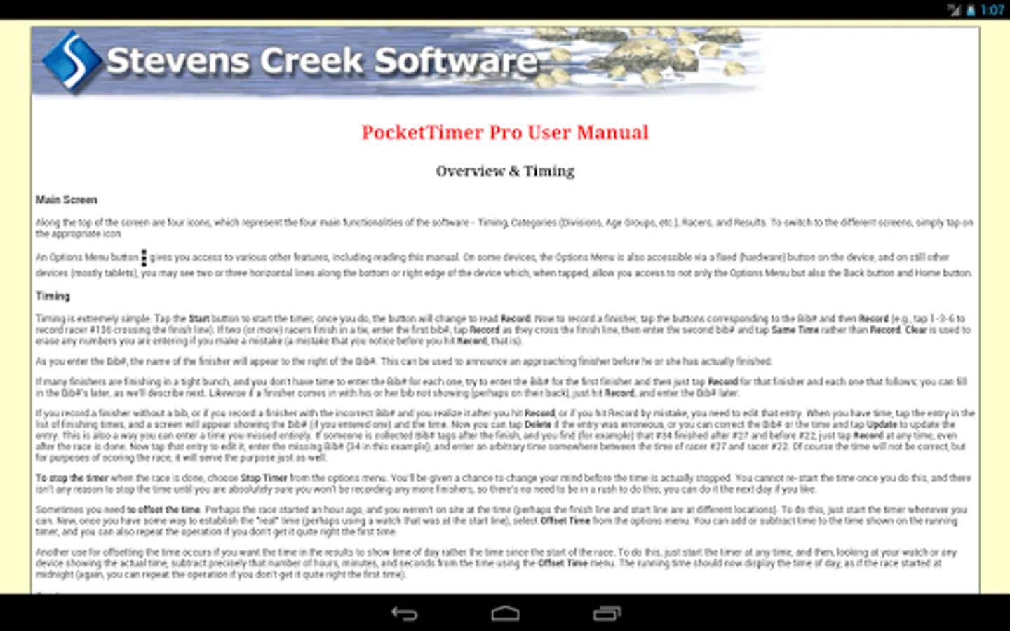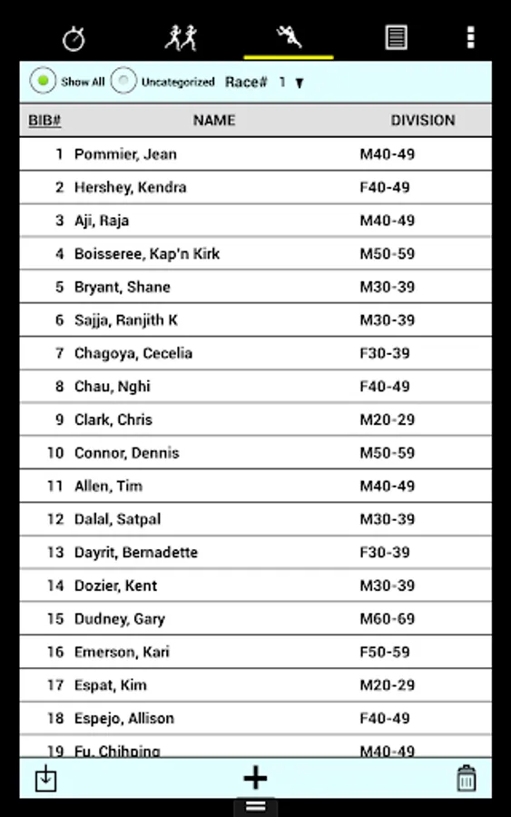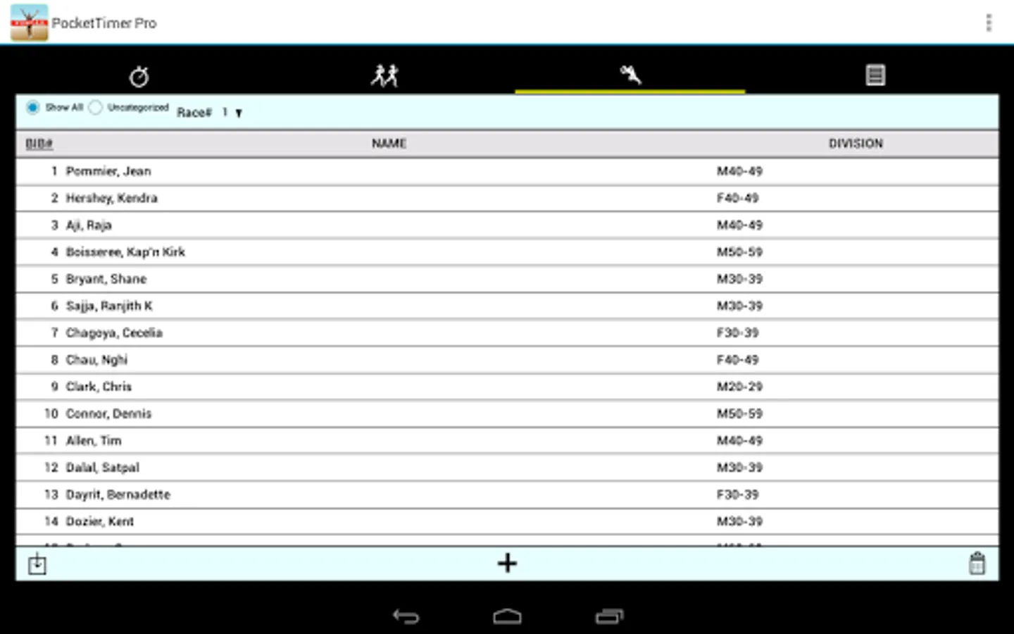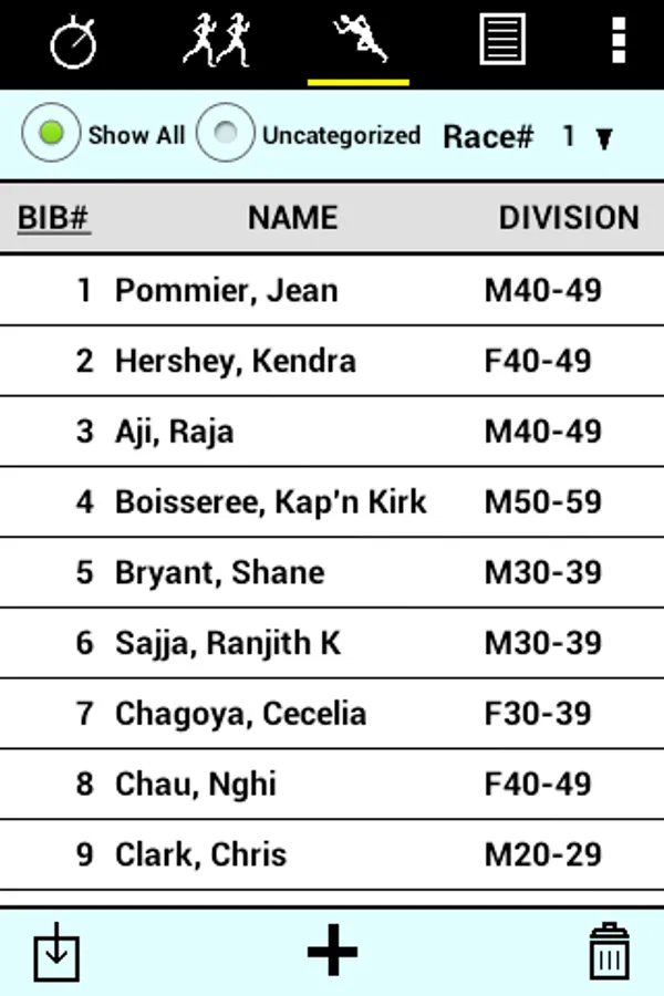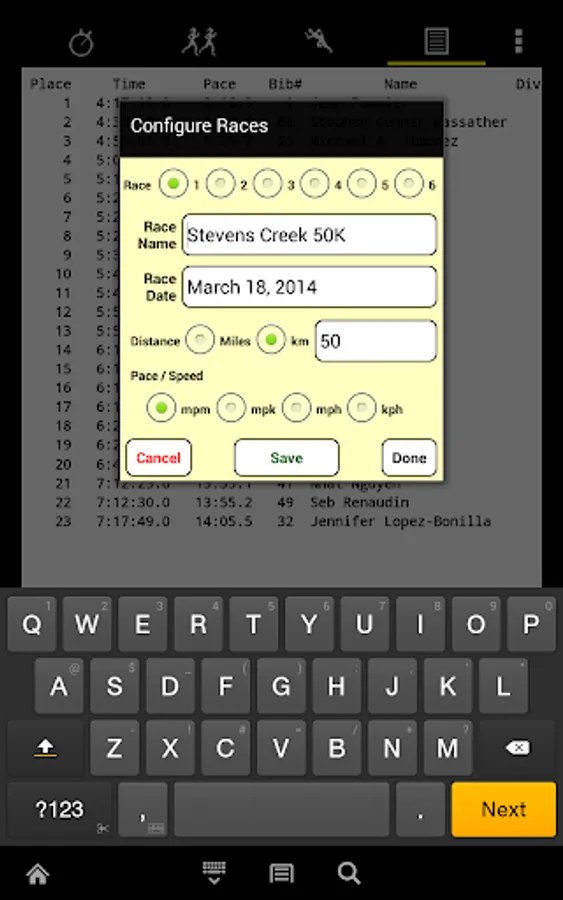 • Categories and racers can be entered on the device, downloaded from a file on the Web or in a Dropbox™ account, or read from the SD card