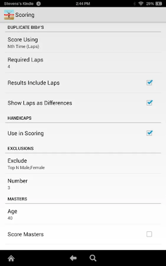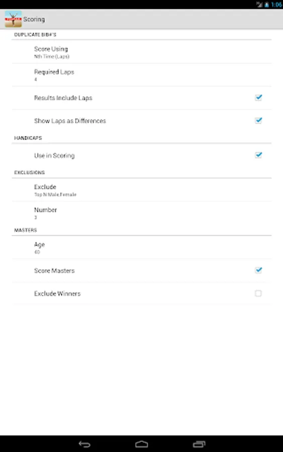 • Optional scoring of masters division, with optional exclusion of those top finishers from further division placings
