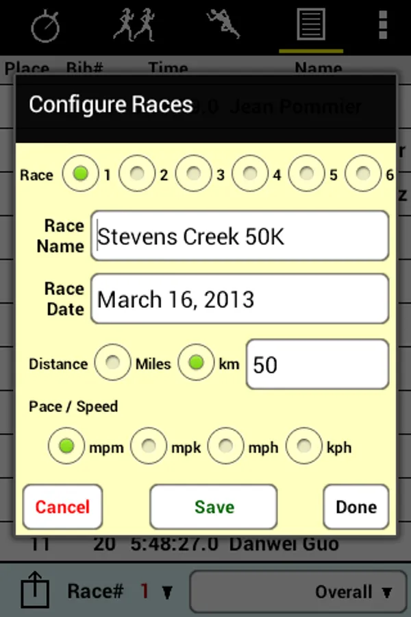 • Uploaded results include pace calculated from distance (enterable in miles or kilometers) and pace (enterable in minutes per mile or per kilometer, or miles or kilometers per hour)