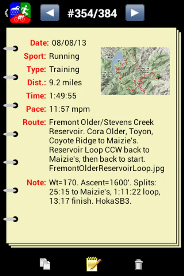 o Record distance, time, and pace (enter any two and the third is automatically calculated), along with date, sport, category (race, training, or interval workout), route or workout description, and notes.