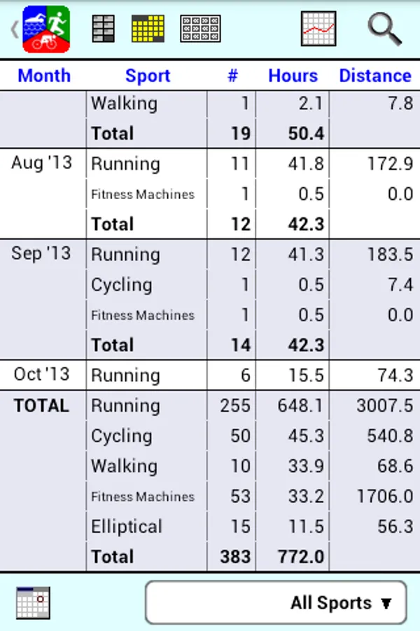o Display time, distance, pace, and #workouts totals in list or graphical form, by week, month, or year, for all sports or any one sport