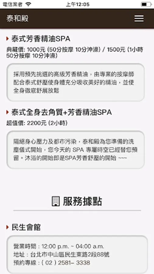 本館指壓包廂與SPA包廂分別有單人包廂、3人包廂、4人包廂及5人包廂空間選擇,都是以實體隔間來建置,提供最舒適的空間,單人包廂除了擁有3米x2米的超大空間外每間包廂都配備有24吋或32吋液晶大電視,而每間油壓包廂裡更是擁有獨立的個人盥洗室,可說是相當罕見的大手筆規劃呢。每位客人使用過的床包枕套馬上立即更換!每月固定全館消毒一次,本店除了擁有非常完善的設備及環境外我們更注重環境及個人衛生。泰和殿泰式SPA養生會館一向秉持技術、環境、衛生、設備第一的堅持,希望愛好這樣健康的泰式按摩的朋友們可以相邀三五好友或情侶、夫妻一同前來、我們特別多建置了雙人包廂及多人包廂可以讓您與朋友一起享受遠離工作的疲勞壓力