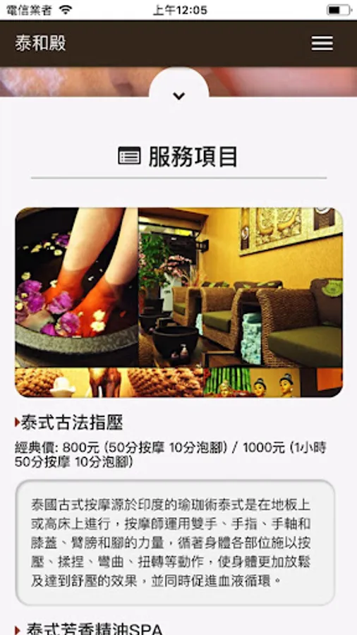 泰式按摩是古代泰王招待皇家貴族的最高禮節,可舒緩疲勞,釋放壓力,促進血液循環,泰式按摩師從足部開始透過推、拉、扳、按、壓、揉、拿身體的各部位,促進血液加速循環,致使身體放鬆。泰式按摩的動作看似用力其實極為柔和,按摩師巧妙地運用手、肘、膝、大腿等肢體借力使力,再加上類似音樂節奏富有節拍性地輕緩柔急地按壓,讓人忘我地、漸次地達到放鬆效果,又有被動式瑜珈之稱,現在您不必遠赴泰國,來一趟泰和殿泰式SPA養生會館給您平民的價格、貴族的享受。