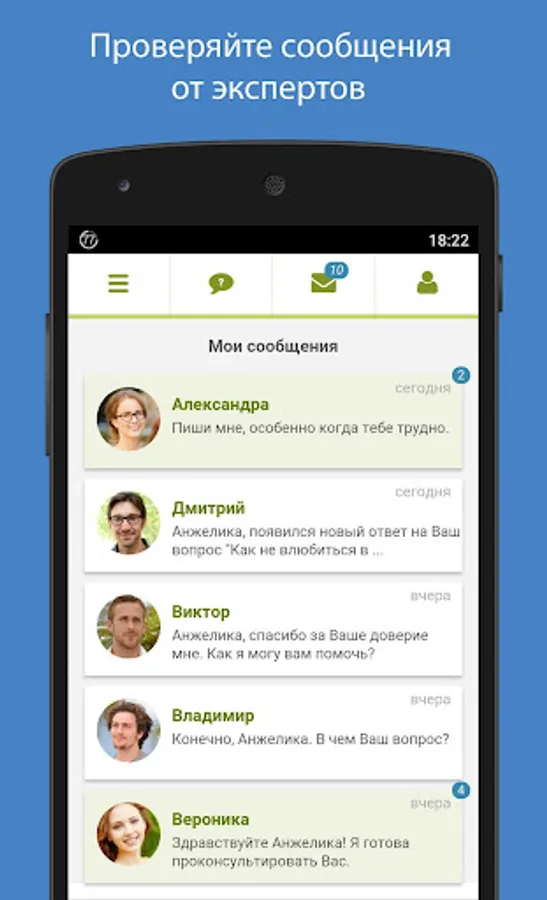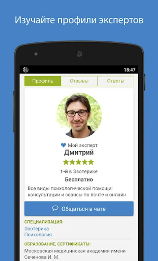 Looking for a good specialist? The application allows you to receive online consultations of a lawyer, psychologist, clairvoyant, psychic, cosmetologist, doctor, sexologist, tutor, programmer and more 24 hours a day.