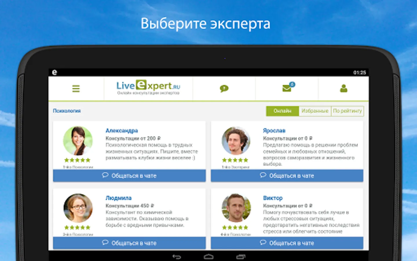 - choose an expert by analyzing profiles and customer reviews, and immediately consult with him in a private chat.