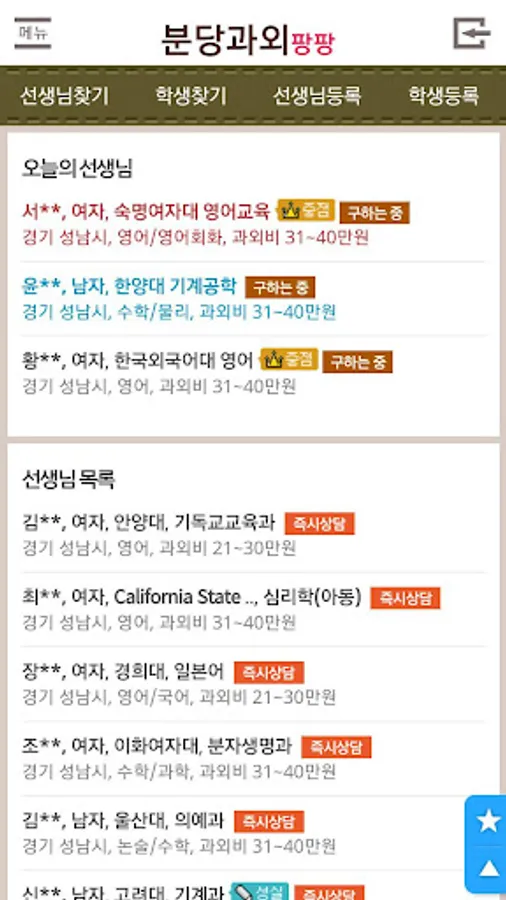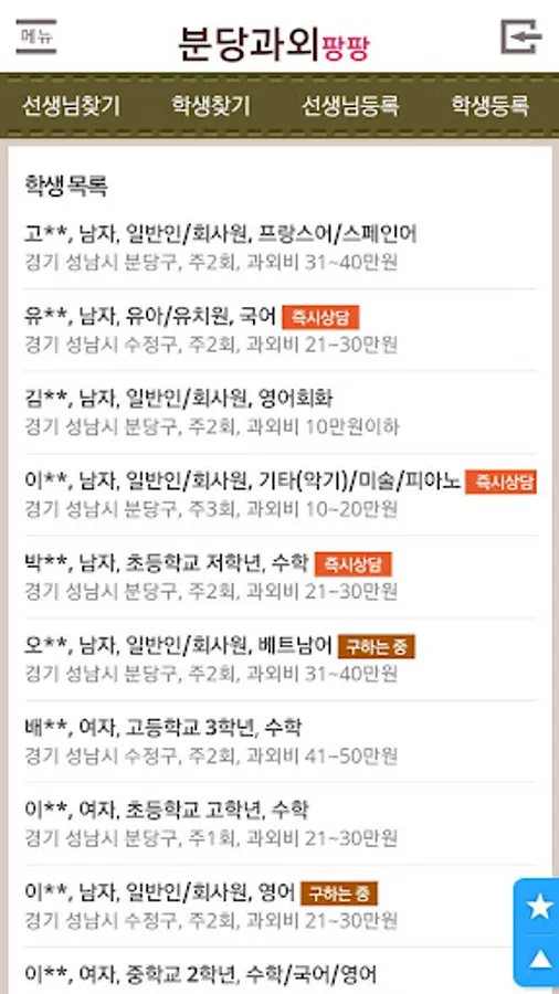 성남시 분당, 중원구, 중원구 과외학생분들은