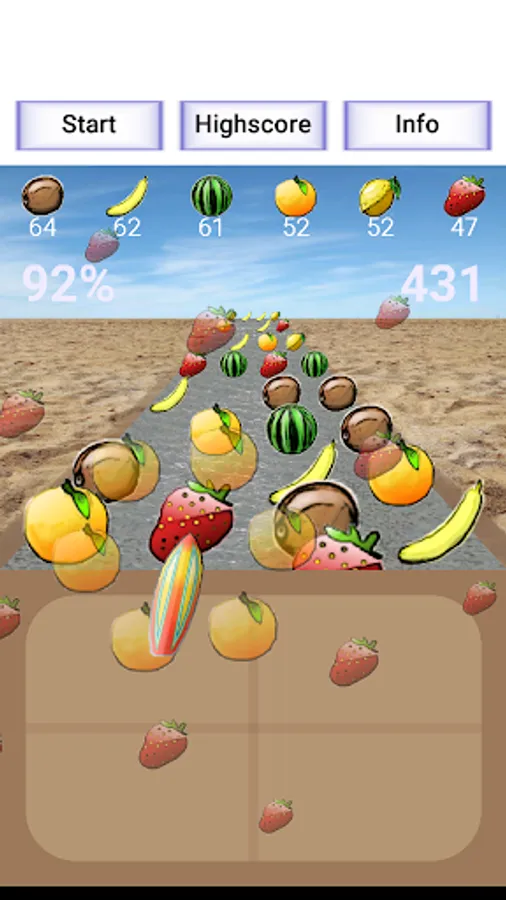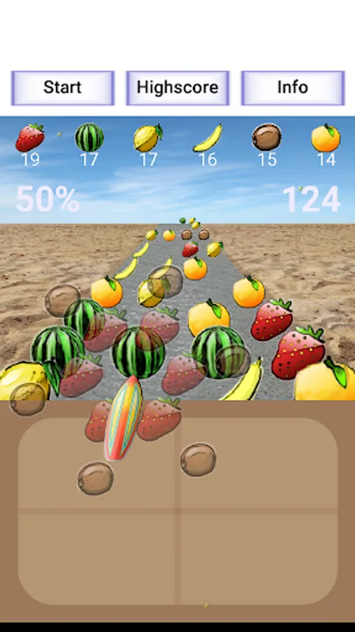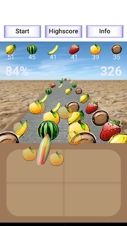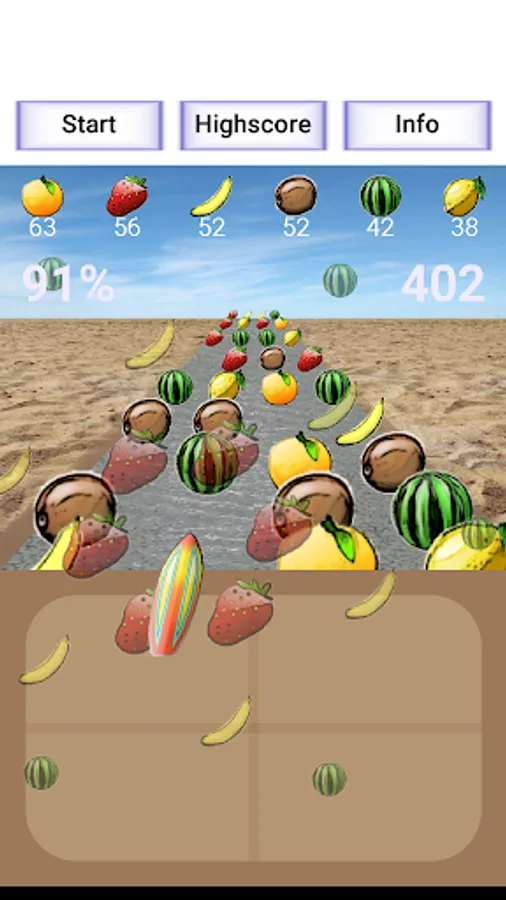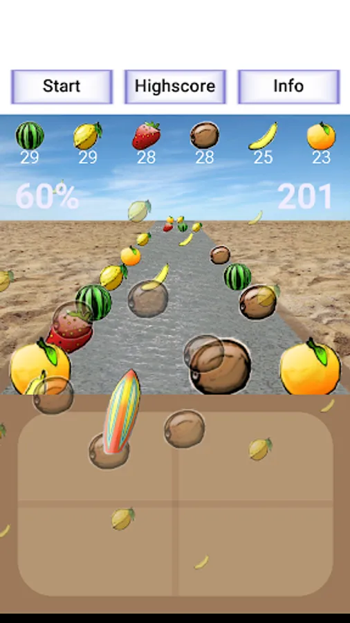 Time for the beach, sun, sea and ... lots of quick fruit. Different types of fruit swim on the river at different speeds. The fruits hit are counted and scored at the end of the game. The highest fruit counter receives the highest point multiplier. The result can optionally be entered in the highscore. The alternation between tension and relaxation refreshes the senses.