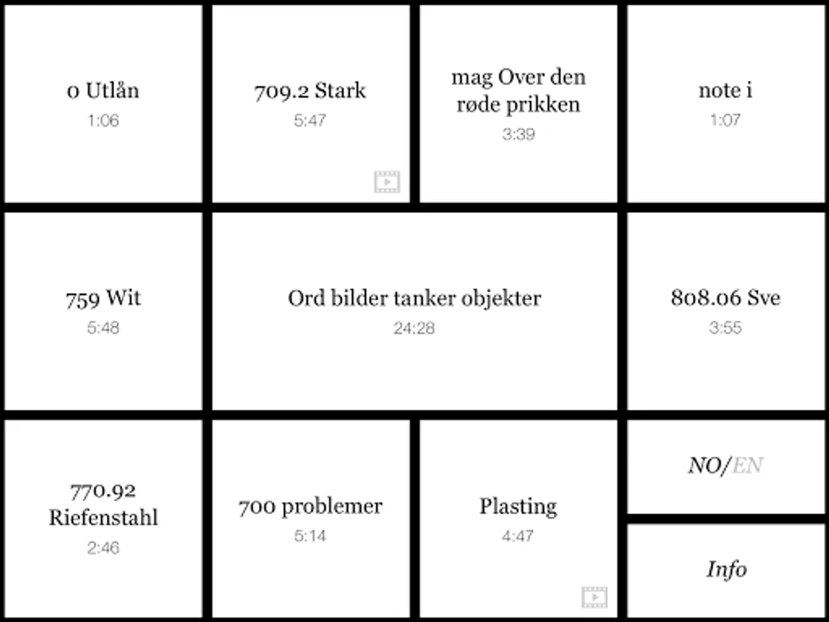 Words Images Thoughts Objects is an art project and a site specific audio guide made by Vilde Salhus Roed for the Fine Art and Design Library, the University of Bergen Library. The audio guide takes you around in the library, with Dewey Decimal Classification System as framework, and with Vilde's personal experiences, associations and fields of interest as the point of departure.