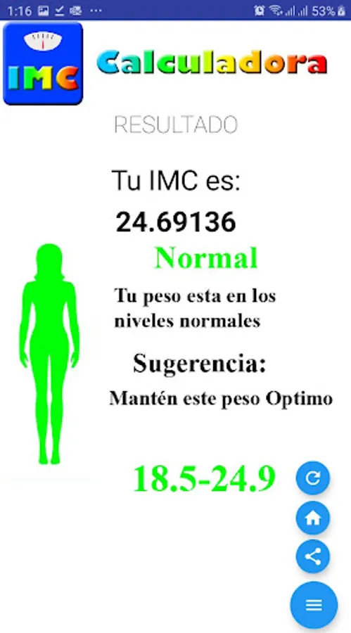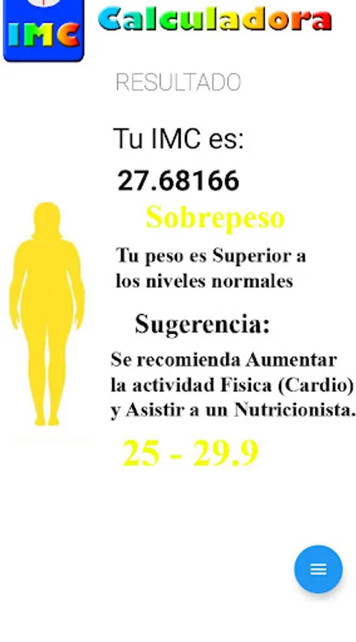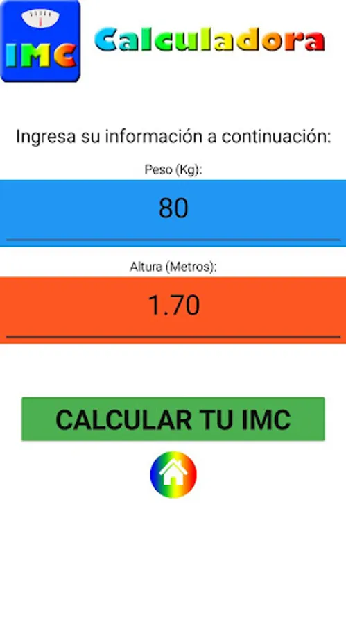 This "BMI Calculator" application calculates the Body Mass Index Based on a mathematical formulation that studies the relationship between a person's mass and Squared size to determine the amount of fat and know if we have the ideal weight, whether we should lower or If we must gain weight.
