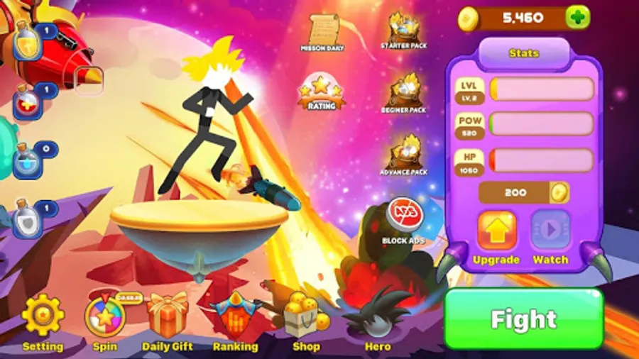 Try to collect many coins to upgrade characters to become the strongest. Join the solo arena to earn coin and training skills of a super Zaiyan. Use skill super stick z to defeat the evil.