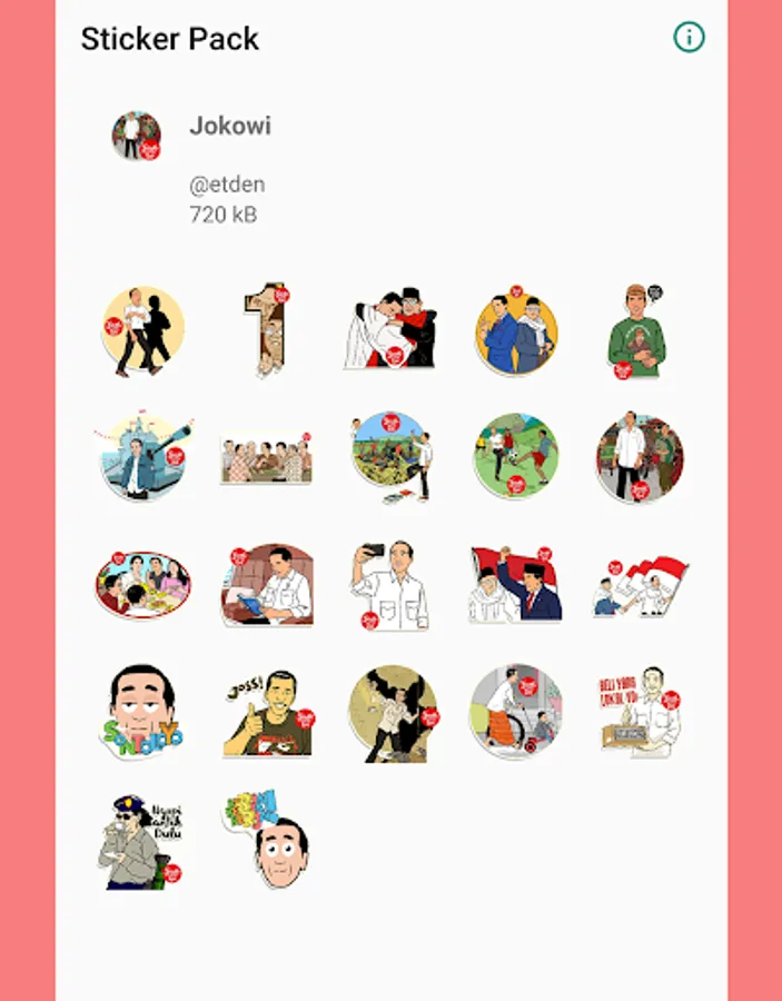 Karena satu dan lain hal, aplikasi ini tidak bisa di-update lagi, untuk yang terbaru dan akan diupdate, unduh versi 2 di sini: https://play.google.com/store/apps/details?id=com.sticker.jokowiversidua